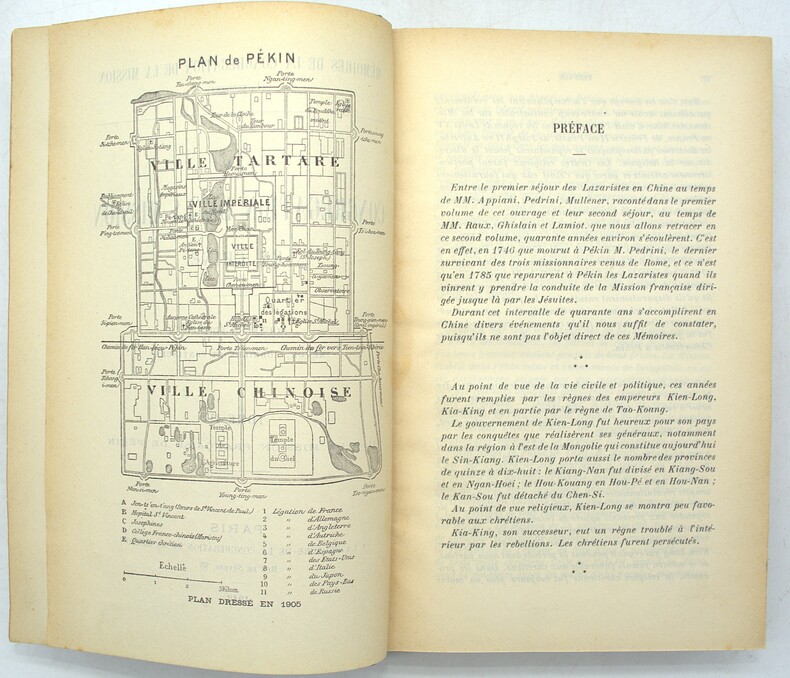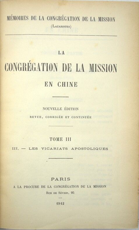 Nouvelle édition, hors commerce, consacrée à l’histoire des missions lazaristes en Chine, formant une refonte et un développement de la section chinoise parue dans la première série des Mémoires de la Congrégation de la Mission au milieu du XIXe siècle (première édition généralement citée vers 1865). Elle couvre l'histoire des missions lazaristes en Chine de 1697 à environ 1910, avec notices biographiques des missionnaires, documents historiques et correspondances concernant les différents vicariats apostoliques (Pékin, Kiang-si, Tché-kiang, Mongolie, Hou-kouang, Ho-nan, Seu-tch'ouan). Source primaire majeure pour l'histoire de l'évangélisation catholique en Chine. Ch-3E