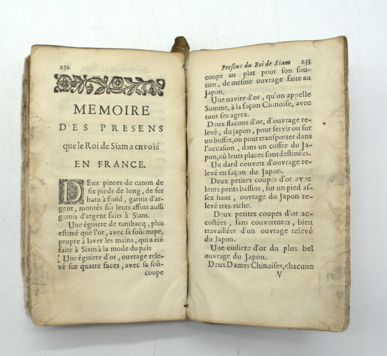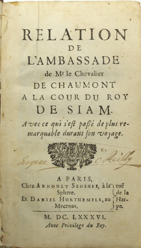 Alexandre de Chaumont-Quitry (1682-1710), ancien chevalier de Malte et ancien major du Levant dans la Royale, fut placé à la tête d'une ambassade au royaume de Siam en décembre 1684. Il s'acquitta avec succès de sa tâche et signa en 1685 un traité accordant des privilèges commerciaux à la France et l'ouverture du Siam aux missionnaires. La présente relation complète les mémoires de deux membres de sa suite d'ambassade, le Père Tachard et l'abbé de Choisy. En fin d’ouvrage, un catalogue décrivant près de 400 cadeaux offerts par le Roi du Siam à Louis XIV, ainsi : « Deux dames chinoises, chacune sur paon et pouvant par ressort marcher sur une table, un service de table de l'Empereur du Japon, un coffre plein de nids d'oiseaux, deux cornes de Rhinocéros, six cents porcelaines très fines, … ». M3-Et4