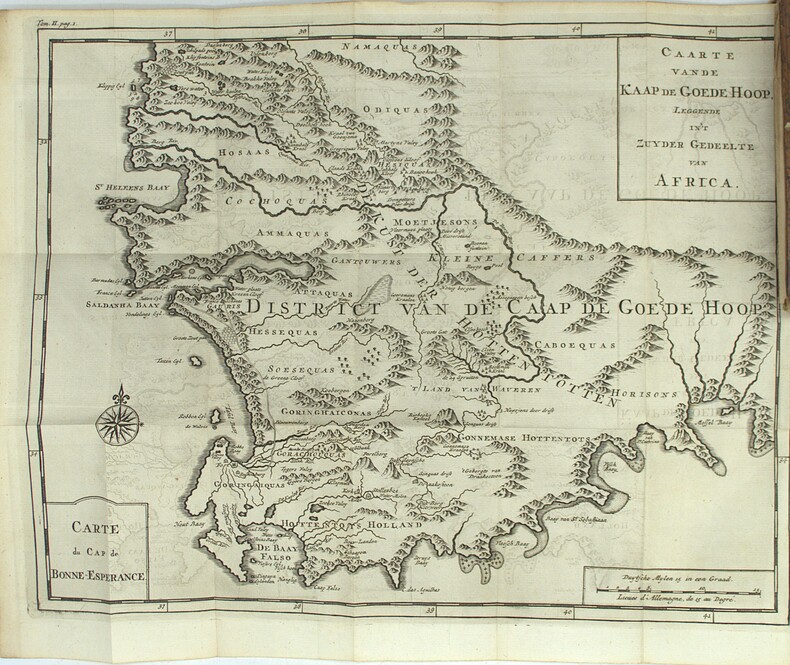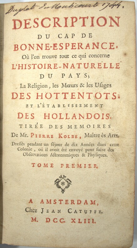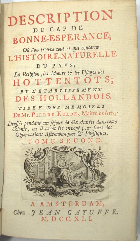 Illustré de 5 cartes dépliantes et 25 gravures dont 1 dépliante, édition originale des tome 2 et 3, le tome 1 en seconde édition Pierre Kolbe quitta Berlin en octobre 1704 et ne parvint à son but, le cap de Bonne Espérance, qu’en juin 1705. Employé par la colonie hollandaise comme secrétaire de district, il rassembla de nombreuses informations sur la région, et fournit des observations très complètes sur les mœurs des Hottentots : habillement et nourriture, religion, gouvernement et justice, agriculture (avec un chapitre sur les vins du Cap), chasse et pêche, mines, chirurgie, mariage, accouchement, éducation des enfants, musique et danse, funérailles. Un petit lexique latin-hottentot-français est également présent. Le tome III constitue le premier essai complet de la faune et la flore du Cap. Atteint de cécité partielle, Kolbe rentra en Allemagne après un séjour d’une dizaine d’années. Ce récit fut d’abord publié en hollandais et en allemand en 1727, puis traduit en français en 1741. L’ouvrage constituait alors la seule description détaillée de la région et fut plusieurs fois réédité. Ch-3B