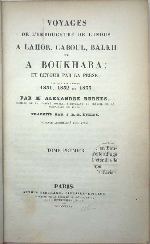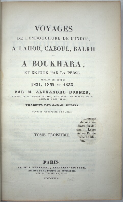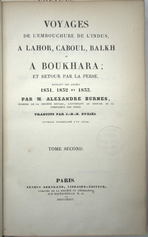 Édition originale française, sans l’atlas. Sir Alexander Burnes (1805-1841), surnommé « Bokhara Burnes », fut un explorateur et agent politique britannique qui joua un rôle clé dans le « Grand Jeu », la rivalité entre la Grande-Bretagne et la Russie tsariste pour le contrôle de l'Asie centrale. Après avoir rejoint l'armée en 1821 et s'être distingué par sa maîtrise des langues locales, il mena plusieurs missions diplomatiques et d'exploration décisives. En 1831, il organisa notamment la première rencontre entre le Maharajah Ranjit Singh et un commandant britannique, Lord Bentinck, lors de laquelle fut exposé le célèbre diamant Koh-i-Noor. Il cartographia également le fleuve Indus et reconnut en secret la route de Kaboul à Boukhara, produisant les premiers rapports détaillés sur la politique afghane. Son récit de voyage publié en 1834 connut un immense succès et lui valut la reconnaissance de prestigieuses sociétés savantes, dont la Royal Society et les sociétés géographiques britannique et française. Ch-1A