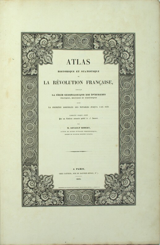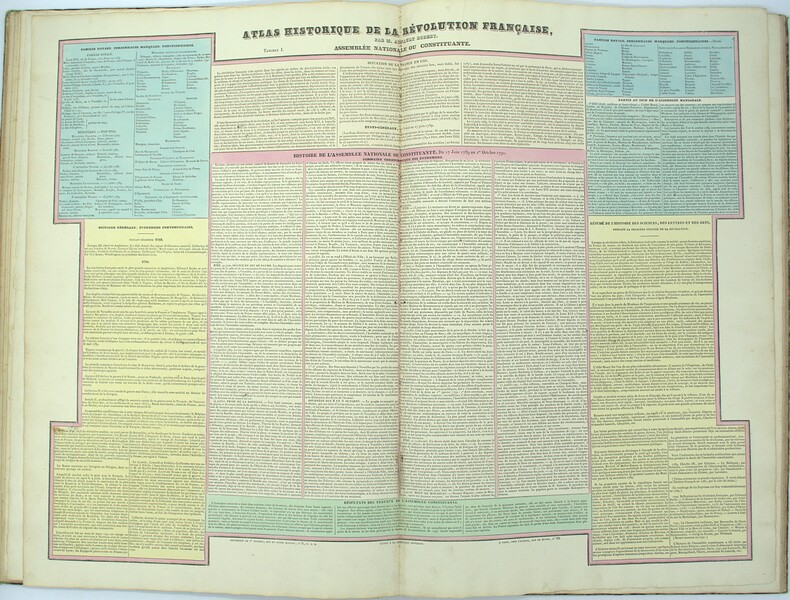Édition originale de cet atlas historique et statistique contenant la série chronologique des événements politiques, militaires et scientifiques depuis la première assemblée des notables jusqu'à l'an 1833. On y trouve 15 tableaux en couleurs à double page. Chacun des neuf premiers tableaux est un exposé complet de l'une des périodes du grand drame de la Révolution. Deux autres tableaux (n°X et XI) présentent un exposé des grandes institutions que la Révolution a créées. Le tableau XIII est consacré à la vie de Napoléon, tandis le tableau XIV présente une carte géographique de la France et des régions environnantes pendant la Révolution. Ch-3