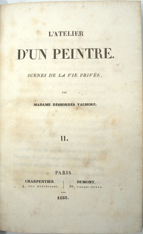 Rare première édition. Desbordes-Valmore (1786-1859), poétesse, romancière, actrice et chanteuse, est l'une des fondatrices de la poésie romantique française. Son ami Balzac s'est inspiré d'elle pour le personnage principal de La Cousine Bette. Elle a eu une vie difficile et compliquée qui se reflète dans ce roman autobiographique basé sur son séjour, en 1808, chez son oncle, le peintre Constant Desbordes, dans l'ancien monastère des Capucins qu'il partageait avec d'autres artistes parmi lesquels figuraient Girodet de Roussy-Trioson et François Gérard. L'ouvrage offre un témoignage précieux sur la vie artistique parisienne du début du XIXe siècle. Ch-3B