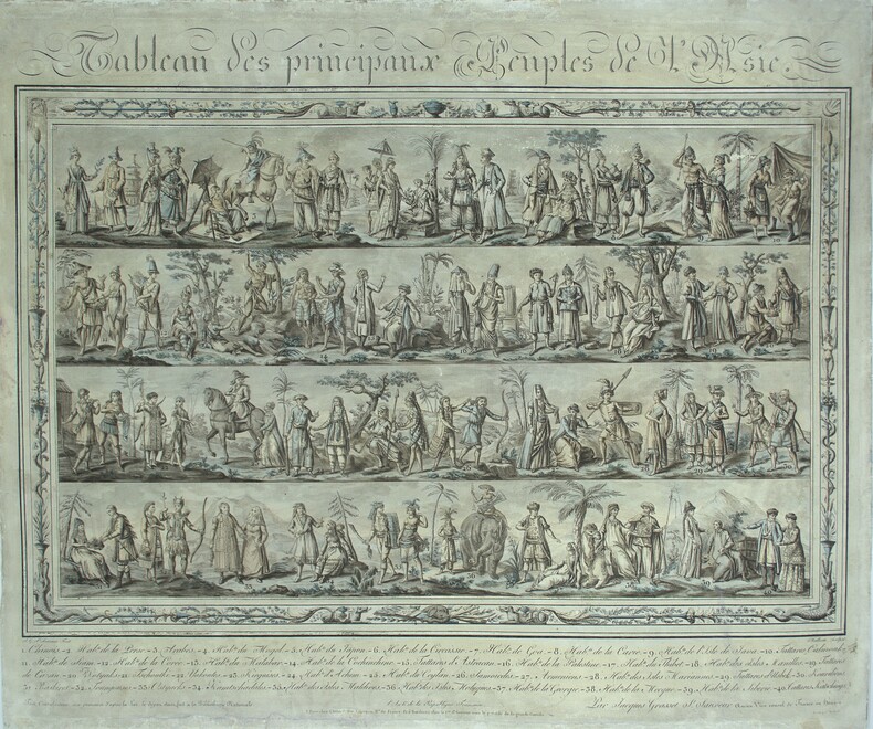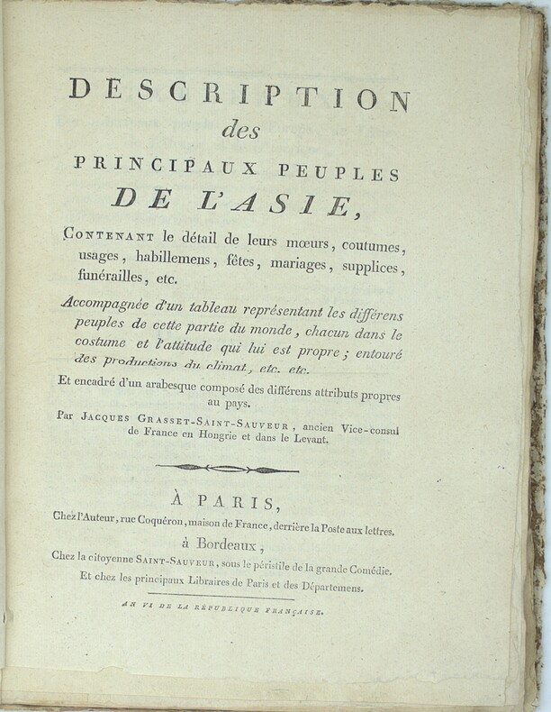 Diplomate, dessinateur et homme de lettres, Jacques Grasset de Saint-Sauveur (1757–1810) publia entre 1784 et 1812 une vingtaine d'ouvrages illustrés sur les costumes et usages des peuples du monde, répondant à un goût du public alors très vif pour la curiosité exotique et la description des nations lointaines. La Description des principaux peuples de l'Asie constitue la partie asiatique d'un ensemble en cinq parties couvrant l'Europe, l'Asie, l'Afrique, l'Amérique et les découvertes de Cook et La Pérouse. Le texte parcourt les peuples d'Asie de la Perse au Japon en passant par l'Inde, la Chine et l'Asie du Sud-Est, décrivant leurs vêtements, cérémonies, rites funéraires et pratiques matrimoniales, accompagné d'une grande gravure dépliante (65x55cm) figurant côte à côte les représentants des principaux peuples d'Asie dans leur costume et leur attitude caractéristique.