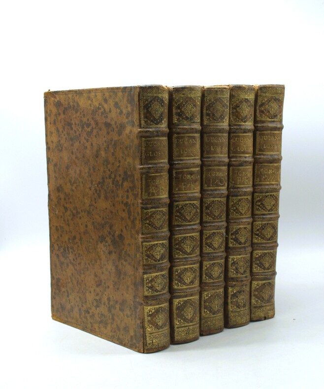 OSMONT, 1733-1736 1733 Six volumes in folio, [4 ff. (faux-titre, titre gravé, titre, portrait) XII pp. [2] ff. XC 1393 colonn. (697 pp.), 1705 colonn. (853 pp.), 1679 colonn. (840 pp.), 1421 colonn. (711 pp.), 1562 colonn. (781 pp.) et 1814 colonn. (907 pp). Reliure en veau marbré, dos à nerfs ornés de pièces de titre et de tomaison et de caissons fleuronnés, tranches rouges (reliure de l'époque). (dos épidermés avec des pertes de cuir, manques aux coiffes, quelques coins un peu émoussés ou tassés, présence de rousseurs parfois fortes, des feuillets uniformément brunis, quelques piqûres). Texte sur deux colonnes. Titres en rouge et en noir ornés d'une belle vignette gravée par F. de POILLY. Au tome I un portrait de l'auteur en frontispice par P. GIFFART, un titre gravé par Le Clerc et un en-tête par BONNART d'après POILLY. Au tome IV on trouve 10 planches gravées (9 de monnaies, 1 de monogrammes). Lettrines. Dans cet ouvrage, l'auteur explique les mots latins dont la signification a été détournée avec le temps, interprète les termes étrangers naturalisés latins par le droit de conquête. Il complète ces explications par de copieux articles sur la théologie, la jurisprudence, les mours du Moyen Âge, les usages de la vie publique ou privée, le rite des églises et l'étiquette des cours, les dignités civiles, ecclésiastiques ou militaires. Le principal ouvrage de du Cange et le plus connu, publié pour la première fois de son vivant, à partir de 1678 à Paris et en 3 volumes in-folio. Cet ouvrage, novateur pour son temps, a été réédité à de nombreuses reprises, en 1733, 1766, 1840, 1883. Ex-libris sur les faux-titres. RARE.