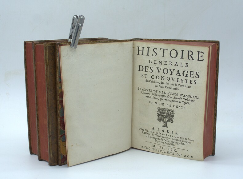Première édition française des trois décades de cette fameuse histoire de l'Amérique par Antonio Herrera y Tordesillas, premier historiographe des Indes Occidentales. La rare troisième décade sera publiée par la veuve de Nicolas Coste, 11 ans plus tard, en 1671. Publiée originellement en castillan entre 1601 et 1615, l'œuvre connut un retentissement considérable dans toute l'Europe. Antonio Herrera y Tordesillas (1549-1625), surnommé le « Prince des historiens des Indes », fut nommé historiographe royal des Indes par Philippe II en 1596. Bénéficiant d'un accès privilégié aux archives de la Couronne espagnole, il composa cette œuvre monumentale — les Décadas — à partir de sources officielles et de témoignages de première main, dont ceux de Bartolomé de las Casas. Elle constitue à ce jour la synthèse la plus complète et la plus rigoureuse de la conquête et de la colonisation de l'Amérique espagnole. La première décade comprend les événements survenus entre 1492 et 1514 : les voyages de Christophe Colomb, les premiers rapports avec les indigènes, les guerres et rivalités politiques, etc. Cette seconde décade, composée en 10 chapitres, comprend les événements entre 1515 et 1520 : la conquête du Mexique, les institutions et coutumes des premières civilisations de la « Nouvelle-Espagne » avant l'arrivée des Européens, les conflits frontaliers avec les Portugais, le passage du détroit par Magellan, etc. La troisième et dernière décade se finit en 1526 : elle nous conte la mort de Magellan, la continuation de la Conquista par Cortés, Almagro, Pizarro, etc. First French edition of this famous history of America by Antonio Herrera y Tordesillas, first historiographer of the West Indies, in a work divided into three decades. The third decade will be published by the widow of Nicolas Coste, 11 years later, in 1671. Antonio Herrera y Tordesillas (1549-1625), known as the "Prince of historians of the Indies", was appointed Royal Historiographer of the Indies by Philip II in 1596. Drawing on privileged access to the Spanish Crown's archives and first-hand accounts, including those of Bartolomé de las Casas, he produced this monumental work, which remains to this day the most comprehensive account of the Spanish conquest and colonisation of America. These three decades cover the events between 1492 and 1526 : the voyages of Columbus, the conquest of Mexico, the institutions and customs of the first civilizations of "New Spain" before the arrival of Europeans, the border conflicts with the Portuguese, the passage of the strait by Magellan, etc. Réf. : Boucher de la Richarderie : "L'ouvrage d'Herrera est précieux : c'est l'histoire de la découverte et de la conquête de l'Amérique espagnole la plus détaillée que nous ayons.", Brunet III-132, Sabin 31549. M5-C