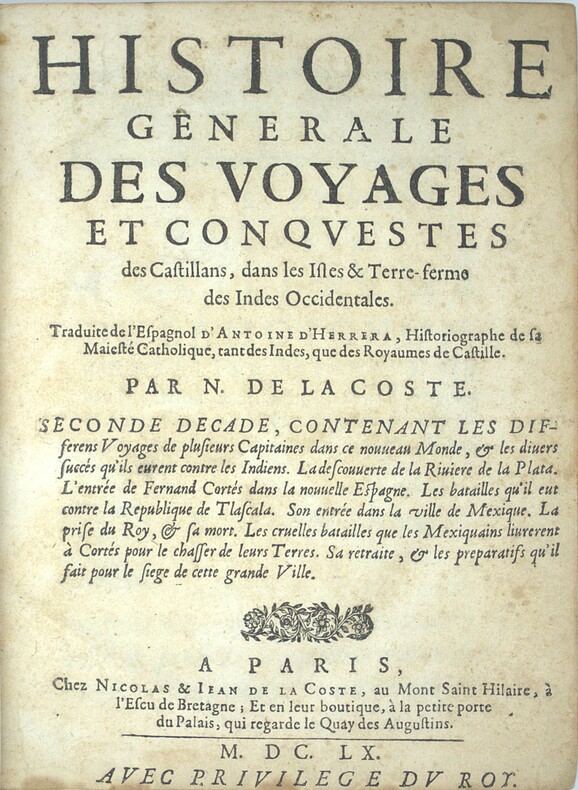 Première édition française des trois décades de cette fameuse histoire de l'Amérique par Antonio Herrera y Tordesillas, premier historiographe des Indes Occidentales. La rare troisième décade sera publiée par la veuve de Nicolas Coste, 11 ans plus tard, en 1671. La première décade comprend les évènements compris en 1492 et 1514, les voyage de Christophe Colomb, les premiers rapports avec les indigènes, les guerres et rivalités politique, etc. Cette seconde décade, composé en 10 chapitres, comprend les événements entre 1515 et 1520, de la conquête du Mexique et d'autres au Mexique, les institutions et coutumes des premières civilisations de la "Nouvelle-Espagne" avant l'arrivée des Européens, les conflits frontaliers avec les Portugais, le passage du détroit par Magellan, etc., la dernière décade se finit en 1526, elle nous conte la mort de Magellan, la continuation de la Conquista par Cortés, Almagro, Pissaro, etc… Antonio Herrera y Tordesillas, surnommé le « Prince des historiens des Indes » est considéré comme le premier historien espagnol de l'Empire d'outre-mer espagnol. First French edition of the second decade of this famous history of America by Antonio Herrera y Tordesillas, first historiographer of the West Indies in three decades, the third decade will be published by the widow of Nicolas Coste, 11 years later, in 1671. This three decade includes the events between 1492 and 1526, from the travels of Colomb, the conquest of Mexico and others in Mexico, the institutions and customs of the first civilizations of "New Spain" before the arrival of Europeans, the border conflicts with the Portuguese, the passage of the strait by Magellan, etc. Réf. : Boucher de la Richarderie : "L'ouvrage d'Herrera est précieux : c'est l'histoire de la découverte et de la conquête de l'Amérique espagnole la plus détaillée que nous ayons.", Brunet III-132, Sabin 31549. P1-4C