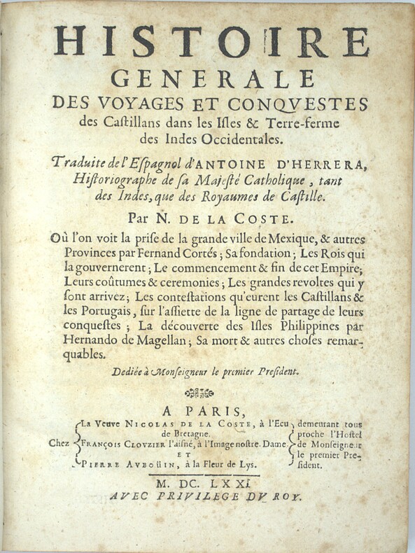 Rare troisième décade de cette fameuse histoire de l'Amérique par Antonio Herrera y Tordesillas, premier historiographe des Indes Occidentales publiée par la veuve de Nicolas Coste, 11 ans plus tard, en 1671. La première décade comprend les évènements compris en 1492 et 1514, les voyage de Christophe Colomb, les premiers rapports avec les indigènes, les guerres et rivalités politique, etc. Cette seconde décade, composé en 10 chapitres, comprend les événements entre 1515 et 1520, de la conquête du Mexique et d'autres au Mexique, les institutions et coutumes des premières civilisations de la "Nouvelle-Espagne" avant l'arrivée des Européens, les conflits frontaliers avec les Portugais, le passage du détroit par Magellan, etc., la dernière décade se finit en 1526, elle nous conte la mort de Magellan, la continuation de la Conquista par Cortés, Almagro, Pissaro, etc… Antonio Herrera y Tordesillas, surnommé le « Prince des historiens des Indes » est considéré comme le premier historien espagnol de l'Empire d'outre-mer espagnol. First French edition of the third decade of this famous history of America by Antonio Herrera y Tordesillas, first historiographer of the West Indies in three decades, published by the widow of Nicolas Coste, 11 years later, in 1671. This three decade includes the events between 1492 and 1526, from the travels of Colomb, the conquest of Mexico and others in Mexico, the institutions and customs of the first civilizations of "New Spain" before the arrival of Europeans, the border conflicts with the Portuguese, the passage of the strait by Magellan, etc. Réf. : Boucher de la Richarderie : "L'ouvrage d'Herrera est précieux : c'est l'histoire de la découverte et de la conquête de l'Amérique espagnole la plus détaillée que nous ayons.", Brunet III-132, Sabin 31549. P1-Et1