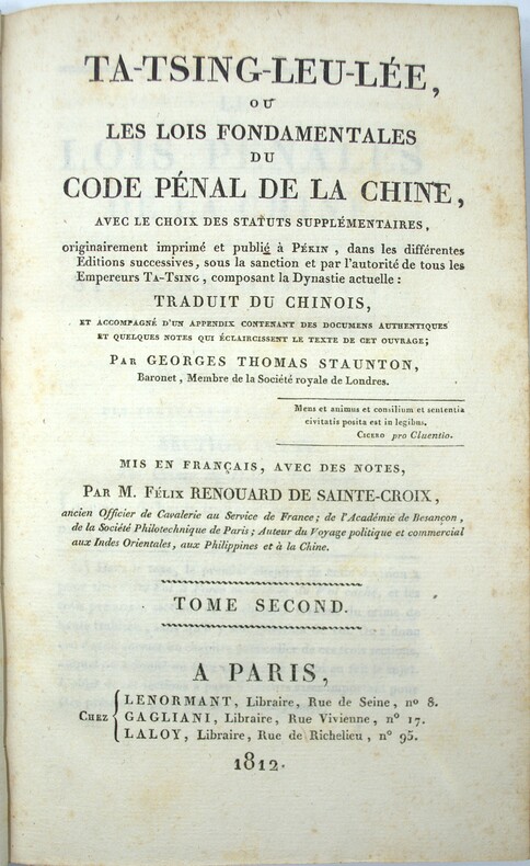 Publié en anglais en 1810, puis traduit en français en 1812, le Ta-Tsing-Leu-Tsée est la première traduction directe du Da Qing lü li, le code juridique de la dynastie Qing. Ce code organise l'ensemble de la vie sociale et pénale de l'Empire : lois générales, civiles, fiscales, rituelles, militaires, criminelles et relatives aux travaux publics, complétés par des édits impériaux sur les peines.. La traduction reste une référence fondatrice de la sinologie occidentale, et un document précieux pour comprendre comment l'Europe du début du XIXe siècle tentait de déchiffrer et d'utiliser la civilisation chinoise à des fins à la fois intellectuelles et commerciales. Le sinologue George Thomas Staunton (1781–1859) avait appris le chinois dès l'enfance et accompagné son père en Chine en 1792, où, en tant que page de l'ambassadeur, il était le seul membre de la délégation capable de s'adresser à l'empereur en chinois. Une carrière au comptoir de Canton de la Compagnie des Indes orientales s'ensuivit. C'est dans ce cadre qu'il traduit le code pénal Qing, publié en anglais en 1810, le premier livre jamais traduit directement du chinois vers l'anglais. M1-Et5