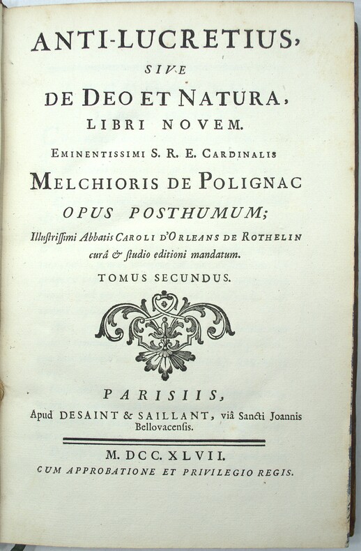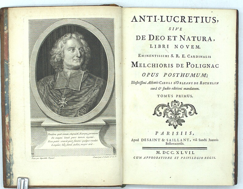 Melchior de Polignac (1661-1741), cardinal et diplomate brillant, ambassadeur en Pologne, plénipotentiaire à Utrecht, membre de l'Académie française, il consacra une grande partie de sa vie à ce poème laissé inachevé et publié à titre posthume. Poème didactique en latin de près de 12 000 vers, répartis en neuf livres, imitant le style de Lucrèce et de Virgile. Réfutation directe du De rerum natura de Lucrèce : Polignac combat le matérialisme, l'atomisme et l'athéisme, visant Gassendi, Hobbes et Spinoza, pour leur opposer, avec les armes mêmes de Lucrèce, une vision chrétienne et cartésienne de Dieu et de la nature.CH-2B