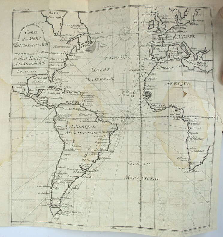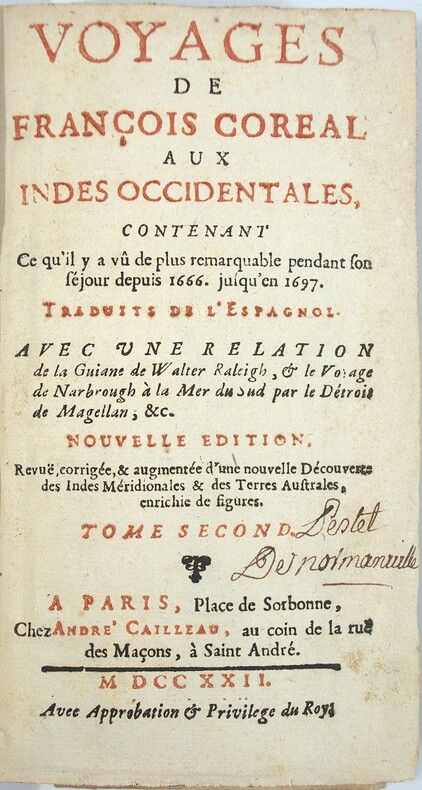 Seconde édition, plus complète que la première publiée la même année à Amsterdam. Généralement regardé comme apocryphe, l'ouvrage relate les aventures de François Coreal, né en 1648 à Carthagène, à travers le Nouveau Monde. Le second volume renferme la Relation de la Guiane, de Sir Walter Raleigh ; la même Relation, par le capitaine Keymis ; la Relation en forme de journal de la découverte des Isles Palaos ; le Journal du voyage du Capitaine Narbrough à la mer du Sud ; le Voyage aux terres australes par A. Jansen Tasman ; la Lettre du Père Nyel sur la Mission des Moxes, peuples de l'Amérique méridionale ; une Relation espagnole de la Mission des Moxes ; la Découverte des Indes méridionales faisant partie des terres australes ( par Gonneville) ; le Premier (et second) voyage d'Alvaro de Mendagna, par le Dr. Christoval de Figueroa ; la Découverte des Terres australes par Quiros en 1605. Les quatre derniers textes ne figuraient pas dans l'édition d'Amsterdam. Ch-3B Sabin, 16781