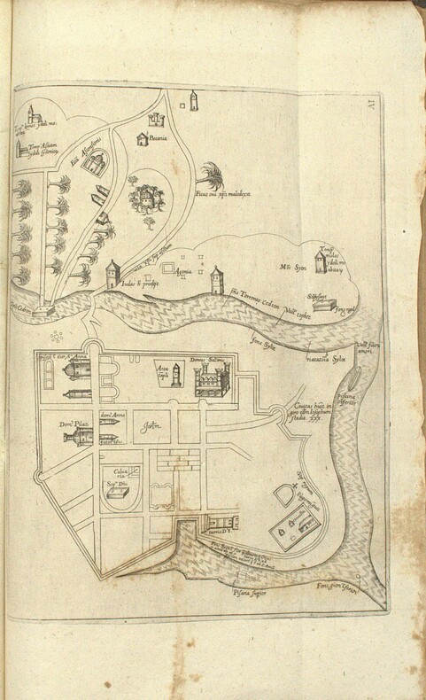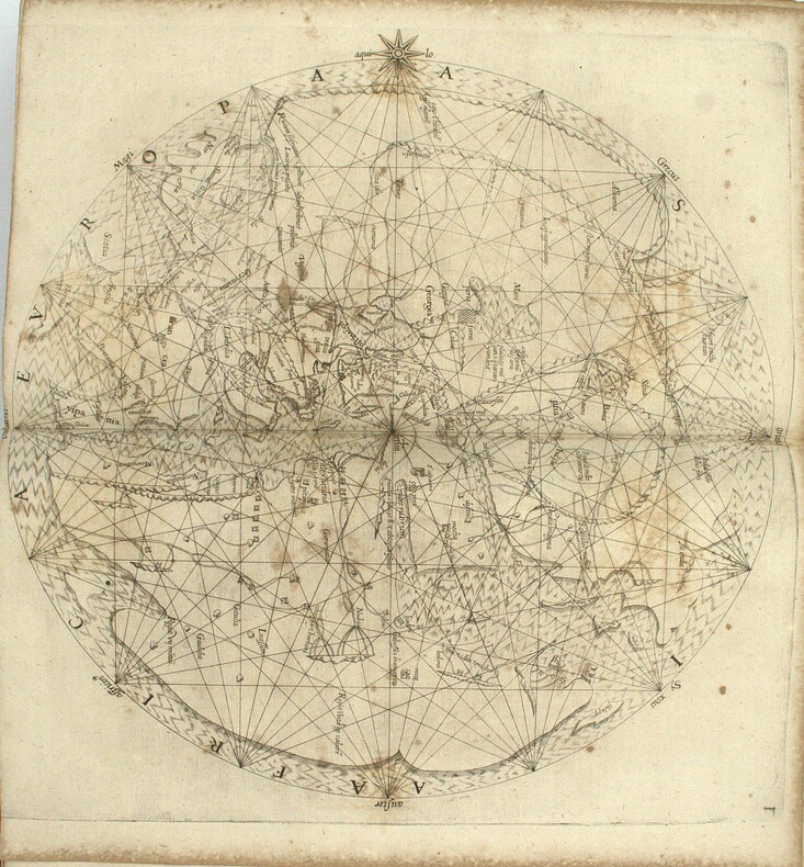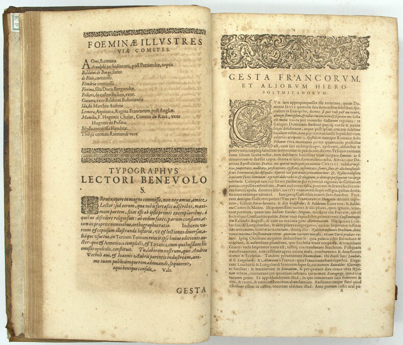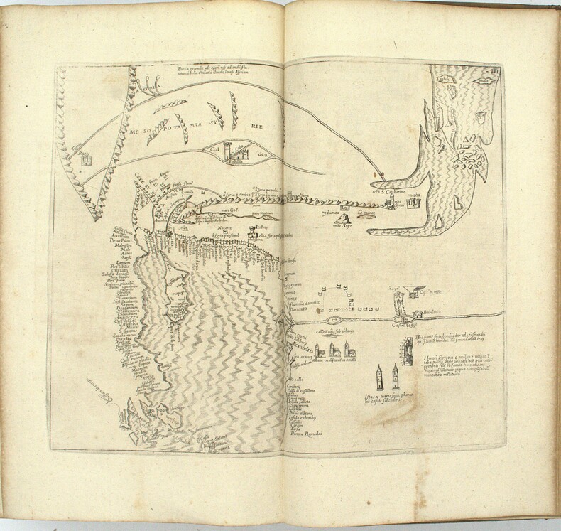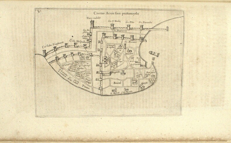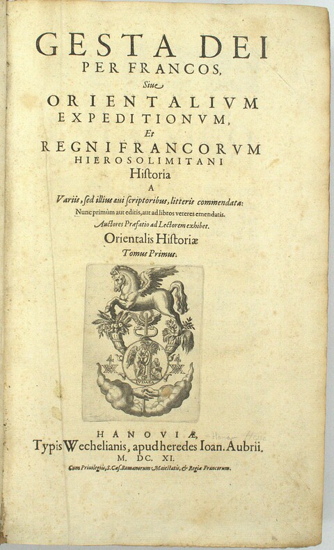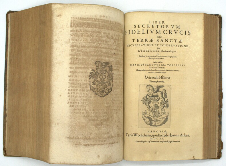 Diplomate, érudit et collectionneur de manuscrits, Jacques Bongars (1554–1612) consacra une grande partie de sa vie à rassembler les sources de l'épopée des croisades. Le résultat de ce travail monumental parut en 1611, l'année avant sa mort : une anthologie de toutes les grandes chroniques latines de la guerre sainte, Guillaume de Tyr, Albert d'Aix, Foucher de Chartres, Jacques de Vitry, accompagnées de listes des princes, prélats et chefs militaires, et de passages relatifs aux origines et à la discipline des Templiers. La seconde partie, paginée séparément, reproduit le Liber Secretorum Fidelium Crucis du patricien vénitien Marino Sanudo Torsello (v. 1270–1343), traité rédigé pour convaincre les puissances chrétiennes de reprendre les armes pour la Terre sainte, et qui constitue l'une des analyses les plus fouillées du commerce, de la politique et de l'histoire de l'Orient latin au tournant du XIVe siècle. C'est dans cette seconde partie que se trouvent les cinq cartes gravées. La plus remarquable est une mappemonde circulaire de type portulan, centrée sur Jérusalem, que Shirley qualifie de « rare exemple de carte médiévale imprimée issue de sources portulanes » (Mapping of the World, n° 276) : il s'agit de la première reproduction imprimée connue de cette carte, jusqu'alors uniquement connue par des copies manuscrites. Son attribution fait débat, tantôt donnée à Pietro Vesconte, tantôt à Marino Sanudo lui-même, le manuscrit original ayant circulé sous les deux noms, mais sa valeur cartographique et sa rareté en font l'un des artefacts les plus recherchés de la cartographie médiévale. Les quatre autres cartes complètent un ensemble géographique d'une cohérence remarquable : une carte de la Terre Sainte divisée selon les douze tribus d'Israël, un plan de Jérusalem figurant ses édifices religieux, un plan d'Acre, dernier bastion des croisés en Orient, et une carte maritime de la Méditerranée orientale d'après les portulans italiens. First edition. One of the two title-page variants recorded by Ioannou. The world map is described by Shirley as one of the few examples of medieval cartography based on portolan sources to survive in printed form, making this volume not only the essential reference on the Crusades but one of the landmarks of the history of cartography. M1-Et0 Atabey 127, Ioannou 49, Shirley 276
