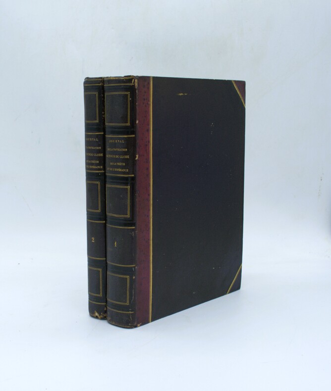 Paris, Arthus Bertrand, 1837, 2 volumes (3) grand in-4° (30x24,5cm), VIII pp., 742 pp., demi chagrin et coins époque, dos lisse avec auteur, titre et tomaison, frottements au dos, quelques rousseurs, défaut à la coiffe supérieure. Édition originale du texte du voyage du Bougainville autour du monde, manque l’atlas.