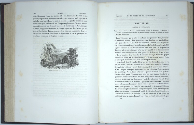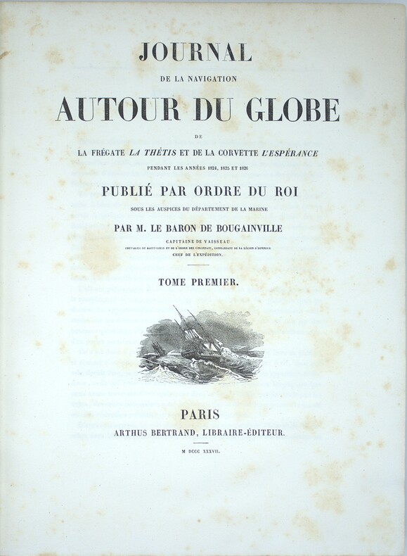 La mission comprenait notamment le rapatriement en France des effets et documents de l’expédition de La Pérouse conservés depuis 1793 à Port-Jackson par les Britanniques, les vestiges du naufrage n’ayant été identifiés que plus tard par Dillon. Ce geste, hautement symbolique, visait à solder un épisode majeur de l’histoire maritime française et à affirmer la continuité et la dignité de la marine royale puis impériale. À cette mission de prestige s’ajoutait une mission diplomatique de représentation, destinée à affirmer la présence française dans les grands ports de l’océan Indien, de l’Asie du Sud-Est, de la Chine et du Pacifique. En 2 tomes, le premier volume contient la relation complète du voyage, depuis le départ de Brest, le 2 mars 1824, jusqu'au retour dans ce port, le 24 juin 1826. Se trouvent également les instructions officielles adressées à Bougainville ainsi que la liste des officiers composant l'état-major (p. 25). Le parcours retracé dans ce premier volume mène les frégates de Brest aux îles Canaries, puis au cap de Bonne-Espérance, à l’île Bourbon, aux établissements français de l’Inde, au détroit de Malacca et à Singapour, aux Philippines et aux mers de Chine avec des relâches à Macao et sur les côtes de la Cochinchine, puis dans l’archipel indonésien. Le voyage se poursuit vers l’Australie, avec un long séjour à Port-Jackson, avant de traverser le Pacifique jusqu’aux côtes du Chili et au port de Valparaíso, de passer par les îles Malouines, de relâcher à Rio de Janeiro, et de regagner enfin la France et le port de Brest. Le second volume présente l’itinéraire de Valparaiso à Buenos-Aires effectué par Edmond de La Touanne par voie terrestre à travers les Andes et les Pampas, suivi du commentaire des planches de la partie historique par le même, de l'histoire naturelle par Lesson, et des observations astronomiques et météorologiques. Ch-2C