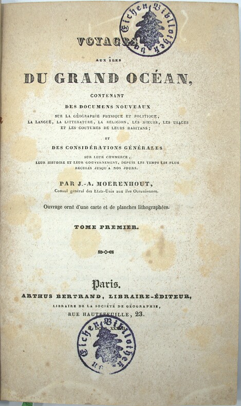 Édition originale d'une grande rareté de cette source de première importance sur Tahiti et la Polynésie qui fut « longtemps un livre introuvable » selon O’Reilly. Il rédigea son ouvrage pendant son consulat à Tahiti , partageant la vie et les coutumes des habitants ,cette œuvre resta tout au long du XIXe siècle la meilleure source d'information dont disposaient les scientifiques et les voyageurs sur les habitants de Polynésie, leurs coutumes, leurs croyances, leur langue, leur organisation sociale et leur histoire , son admirateur le plus célèbre fut Paul Gauguin ,le livre de Moerenhout servira de source pour la rédaction de son manuscrit illustre Ancien Culte Mahorie (1882-1883) qui en cite de longs et fréquents passages. FIRST EDITION. "A very scarce and important work on Tahiti, by a long-time resident who subsequently became a United States Consular official" (Forbes). Moerenhout provides a detailed history of the exploration of Tahiti from the time of Cook and examines all aspects of native culture. Two plates of portraits and two are views of Tahiti. One of the plates shows surviving Bounty mutineer John Adams. M1-Et2 Sabin 49829.