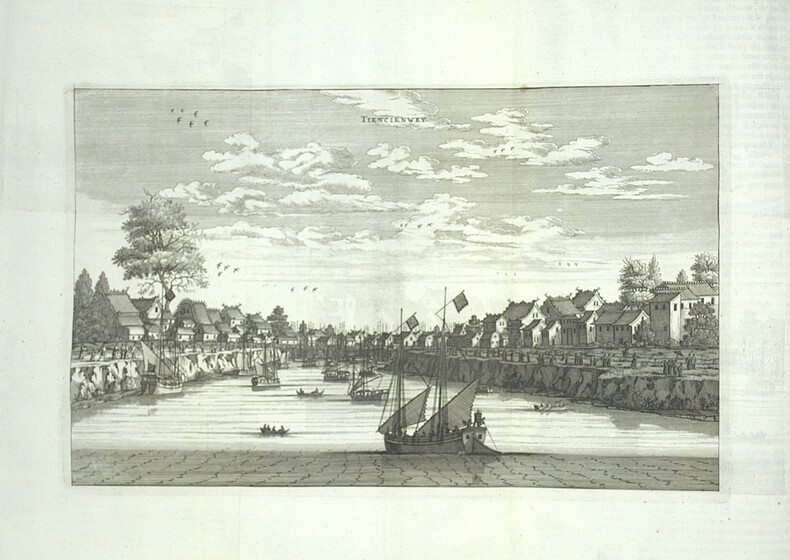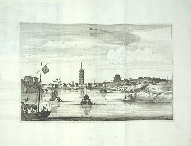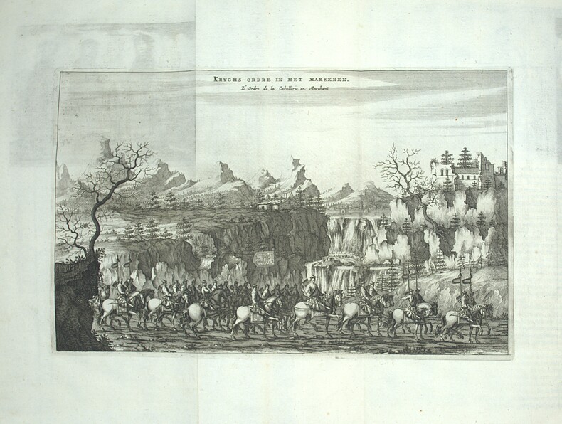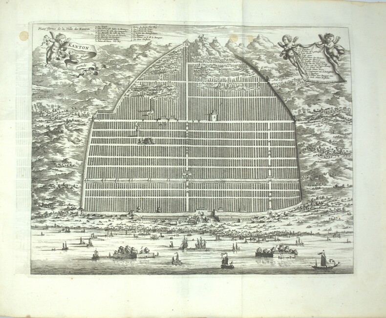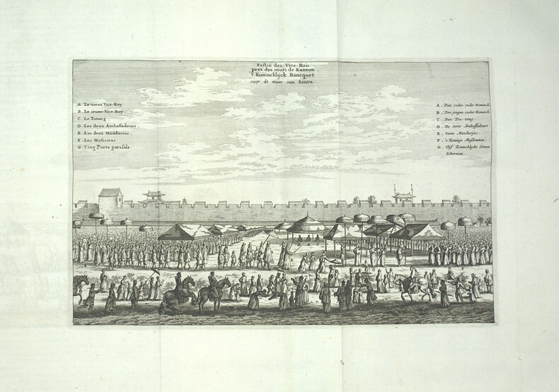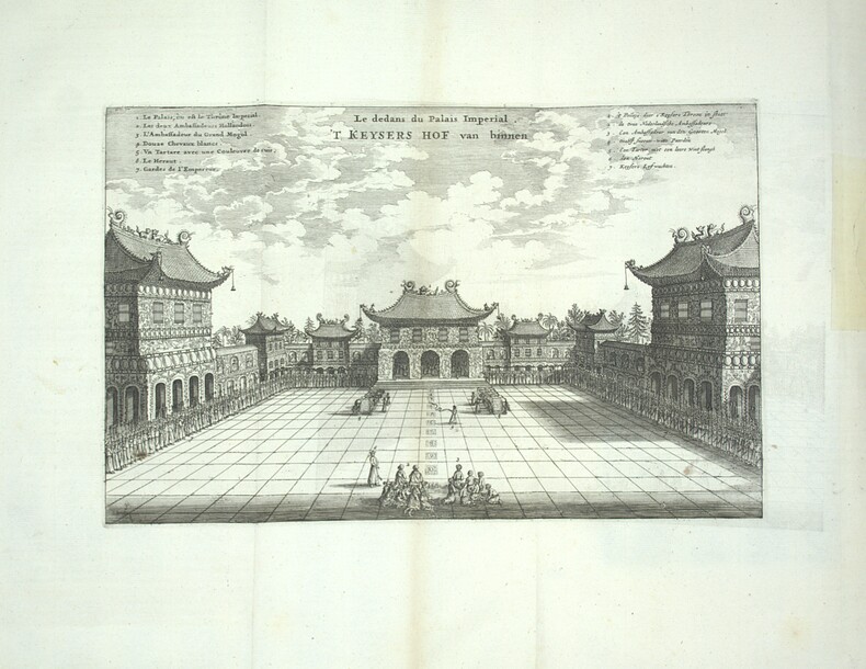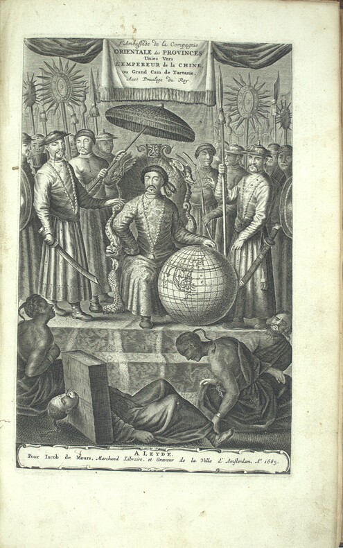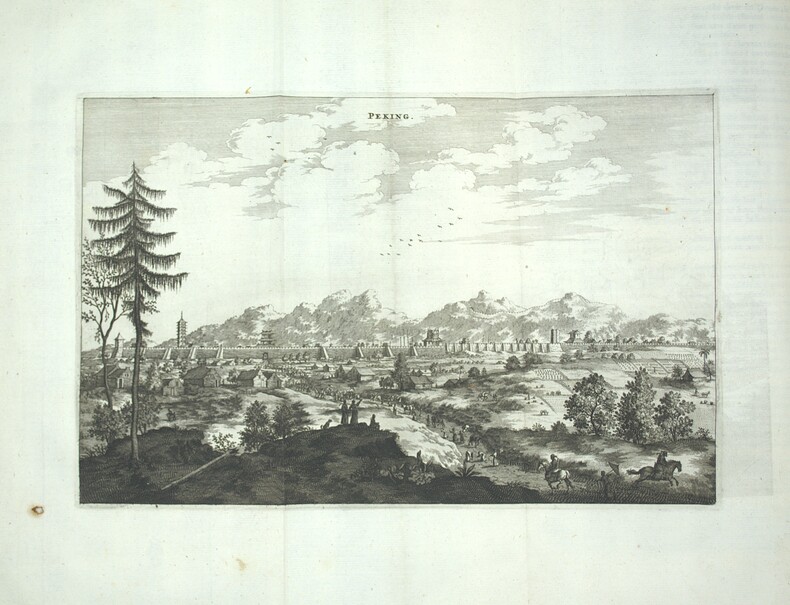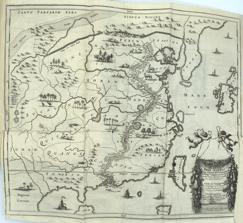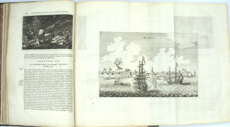 Première édition française, traduite par Jean Le Carpentier. L’ouvrage est distribué en deux parties : la première relate le voyage des émissaires hollandais de Batavia à Pékin et le déroulement de leur ambassade ; la seconde, avec page de titre particulière, offre une description générale de l’empire de Chine abordant l’histoire, la politique, la religion, les sciences et divers aspects de la vie quotidienne. Johan Nieuhof (1630-1672), au service de la Dutch East India Company, participa à l’ambassade comme dessinateur et chroniqueur. Son récit relate l’expédition envoyée en 1655 auprès de l’empereur de la dynastie Qing, désigné en Europe comme le « Grand Cham de Tartarie », c’est-à-dire l’empereur Shunzhi Emperor. Les ambassadeurs Pieter de Goyer et Jacob de Keyser quittèrent Batavia et gagnèrent Pékin par la côte puis le Grand Canal. L’ambassade n’aboutit pas à l’ouverture commerciale espérée mais fournit à l’Europe l’un des premiers témoignages détaillés sur la Chine des débuts de la dynastie Qing. La remarquable iconographie gravée dans les ateliers de Jacob van Meurs constitue l’un des ensembles les plus spectaculaires consacrés à la Chine au XVIIe siècle : vues de villes, paysages, monuments, cérémonies, costumes et scènes de la vie quotidienne. Plusieurs de ces compositions furent largement reprises dans la littérature géographique ultérieure, notamment chez Athanasius Kircher, Olfert Dapper ou Arnoldus Montanus. The Dutch being at the height of their power, having supplanted the Portuguese, desired to gain access to China and a portion of the China trade. After much opposition the Government succeeded in sending certain merchants to try the pulse of the Chinese at Canton. Upon their report it was determined to despatch ambassadors from Batavia to the Court of Peking to solicit liberty to trade. This is the embassy written up by Nieuhoff, who was steward to the ambassadors. Its failure led the Dutch to send other embassies.