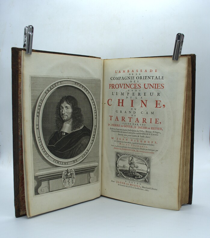 Première édition française du voyage de Pierre de Goyer et Jacob de Keyser envoyés par le conseil des Indes orientales en Chine. Elle parut la même année et chez le même éditeur que l’édition en hollandais. Chadenat, I, 140 ; Tiele, p. 179, Cordier, Bibliotheca Sinica, 2341. En 1655 le gouvernement général nomma Nieuhoff intendant de l’ambassade envoyée en Chine avec Goyer et de Keyser à sa tête. Les ambassadeurs débarquèrent à Canton le 29 juillet 1655 et y restèrent jusqu’au 17 mars 1656. Ils passèrent par Nankin et durent triompher de l’hostilité des jésuites pour parvenir à être admis le 1er octobre 1656 devant l’empereur de Chine. Revenu à Canton, Nieuhoff s’embarqua pour l’Europe le 31 mars 1657. Dédié à Colbert et orné d’un grand portrait du ministre, l’ouvrage est réputé et recherché pour son iconographie très riche de la Chine connue à l époque. Outre un frontispice gravé et une grande carte dépliante de la Chine, 114 jolies gravures dont 34 sur double-page représentent ainsi les paysages, vues de ports et villes, costumes, faune et flore des contrées visitées par l’auteur. Le tirage, très encré, est superbe. Très séduisant exemplaire à grandes marges conservé dans sa reliure de vélin de l’époque. Il porte un ex-libris armorié du XVIIIe siècle et provient de la bibliothèque Johan August Gylling, 1869 avec ex-libris manuscrit et de la librairie H. P. Kraus, avec étiquette.
