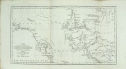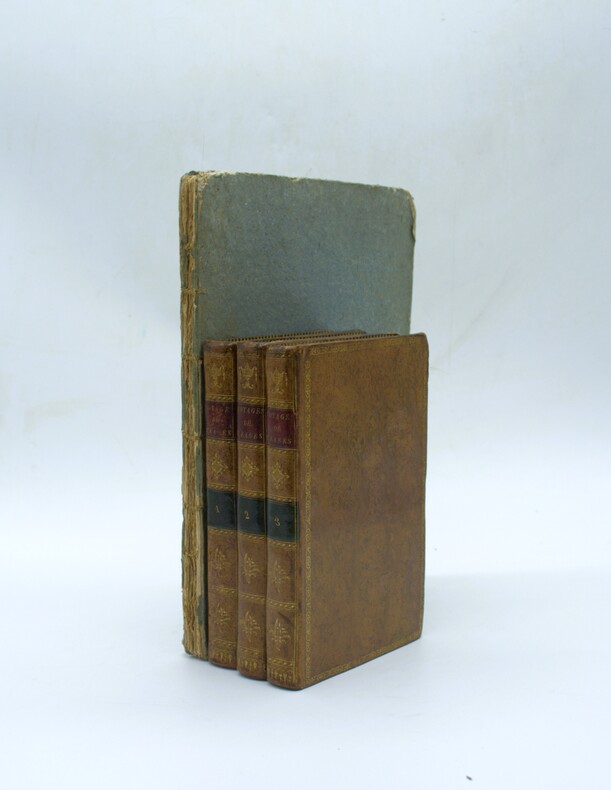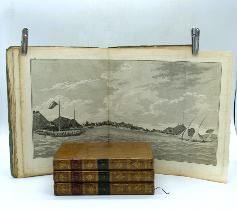 Paris, chez Buisson, An 3 de la République (1795), 4 volumes Texte : 3 tomes in 8° (21x13,5cm), XXIV-391pp, (4) 386pp, et (4) 371pp., veau raciné époque, dos lisse avec pièces de titre rouge et tomaison noire, tranches dorées, frises aux plats, roulettes interne, petits frottements. Atlas : in-4° (31,5x24cm), titre, table des planches, 28 planches HT, portraits, cartes, plans, vues. Exemplaire à toutes marges. Reliure d’attente, dos manquant, carte détachée avec tache aux plis,