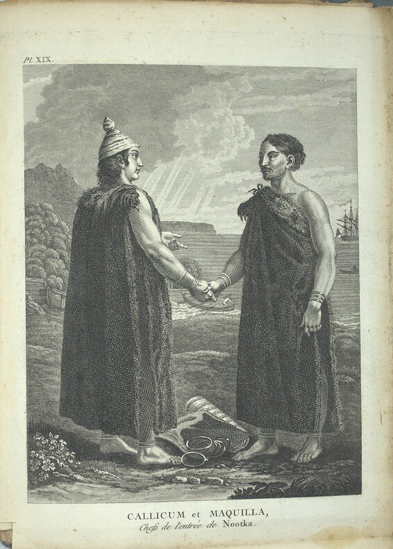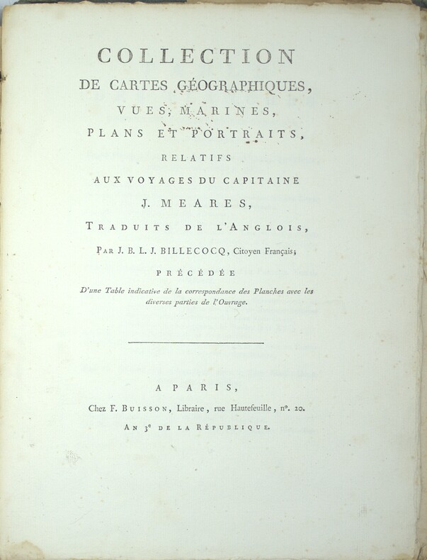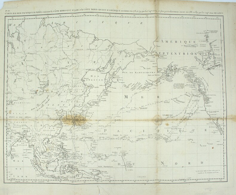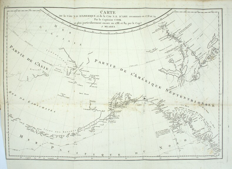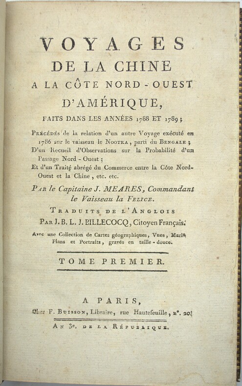ÉDITION ORIGINALE de la traduction française. Très importante relation qui peut être considérée comme une suite et un complément aux grands voyages anglais de 18e. Publiée à Londres en 1790 par le capitaine britannique John Meares, acteur du commerce maritime des fourrures entre la Chine et la côte nord-ouest de l’Amérique. L’ouvrage relate les expéditions conduites depuis Canton vers les rivages du Nootka Sound et de la côte nord-ouest du continent américain, décrivant les conditions de navigation dans le Pacifique nord, les relations avec les populations autochtones et l’organisation du commerce des pelleteries destinées au marché chinois. Il comprend également un mémoire sur la possibilité d’un passage maritime par le nord de l’Amérique ainsi qu’une analyse du système commercial reliant la côte pacifique à la Chine. Le récit s’inscrit dans le contexte des tensions diplomatiques anglo-espagnoles autour de la souveraineté sur la région de Nootka à la fin du XVIII siècle et constitue l’une des sources européennes majeures sur l’exploration et l’exploitation commerciale du littoral du Pacifique nord-ouest après les voyages de James Cook. 3 volumes In 8° (210x130 mm) , full calf & an Atlas of 28 boards, large In 4° (290x220 mm) Bound cardboard, XXIV 391pp, (4) 386pp, and (4) 371pp. The atlas is composed as follows, title page 1ff n.c., table of plates, 28 plates HT, portraits, maps, plans, view. ORIGINAL EDITION of the French translation good copy Very important relationship that can be seen as a continuation and a complement to the great English voyages of the 18th century. A voyage that allowed the English to trade along the coast after the passage of Meares to the English authorities. One of the great voyages that refers to Cook's voyages. Ch-2B