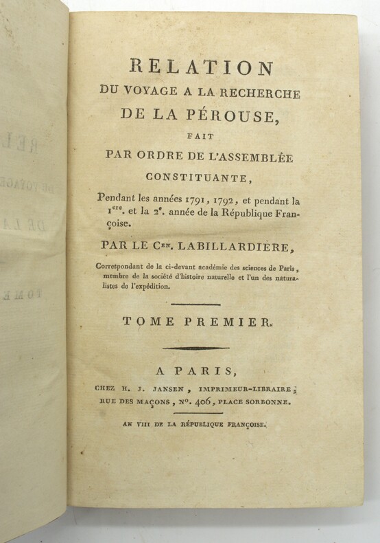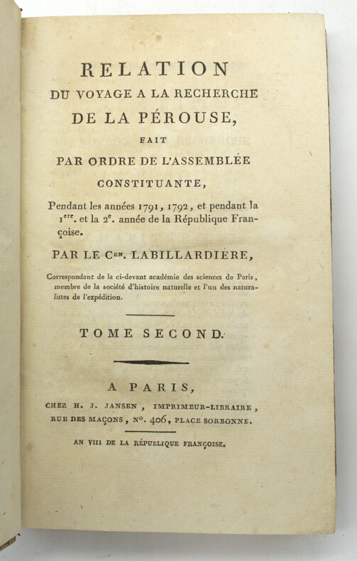 Le botaniste La Billardière (1755-1834) prit part à l'expédition ordonnée par le roi Louis XVI et placée sous le commandement de d'Entrecasteaux à la recherche de La Pérouse dont on était sans nouvelles. Voyage de circumnavigation à caractère scientifique et humanitaire :Ténériffe (dont l'auteur escalada le célèbre Pic), Le Cap, l'Australie, la Tasmanie, la Nouvelle-Calédonie, La Nouvelle-Guinée, Java et l'Île de France. Son récit fournit des observations sur les peuples visités, leurs moeurs, leurs outils. La partie linguistique est très développée (vocabulaires malais, tasmanien et océaniens). Son herbier renfermant 1500 plantes alors inconnues est conservé à Florence et à Genève. (McDonnell, nº 223 ; Sabin, 38420). P1-4D