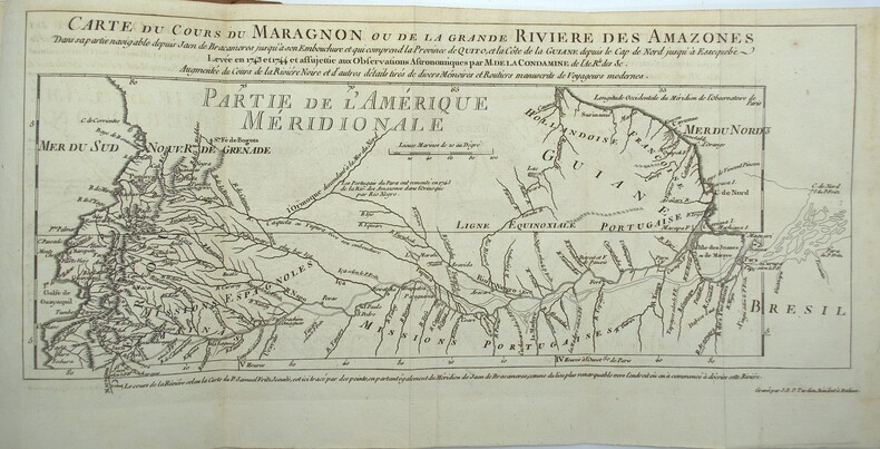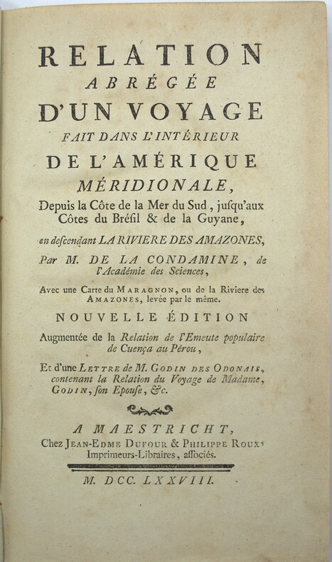 Édition EN PARTIE ORIGINALE, pour la lettre de M. Godin à La Condamine expliquant le voyage périlleux de son épouse de Quito à Cayenne. L'ouvrage (EO 1745) relate l'exploration de l'Amazone et une émeute dans les arènes de Cuenca en 1739. En 1735, La Condamine (1701-1774) fut envoyé au Pérou avec d'autres savants français et espagnols afin de mesurer la longueur d'un arc de méridien près de l'équateur tandis que d'autres savants étaient envoyés au pôle Nord pour des relevés analogues. Leurs calculs permirent de déterminer que les pôles étaient légèrement plats. En plus de l'aspect scientifique de l'ouvrage, l'auteur décrit les ethnies et les plantes (quinine, cacao, caoutchouc ou curare) rencontrées en descendant l'Amazone.Ch-1B Sabin 38485 ; Brunet III-729 ; Chadenat I-614.