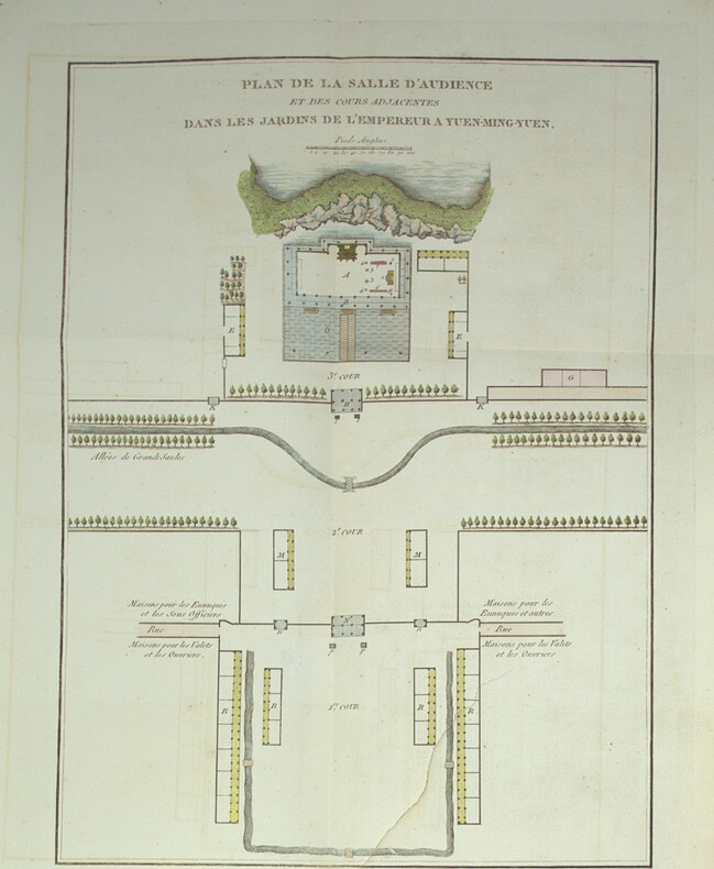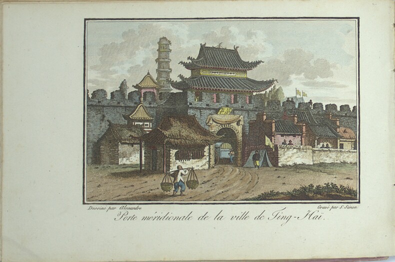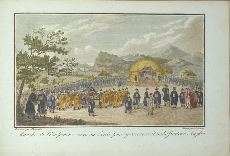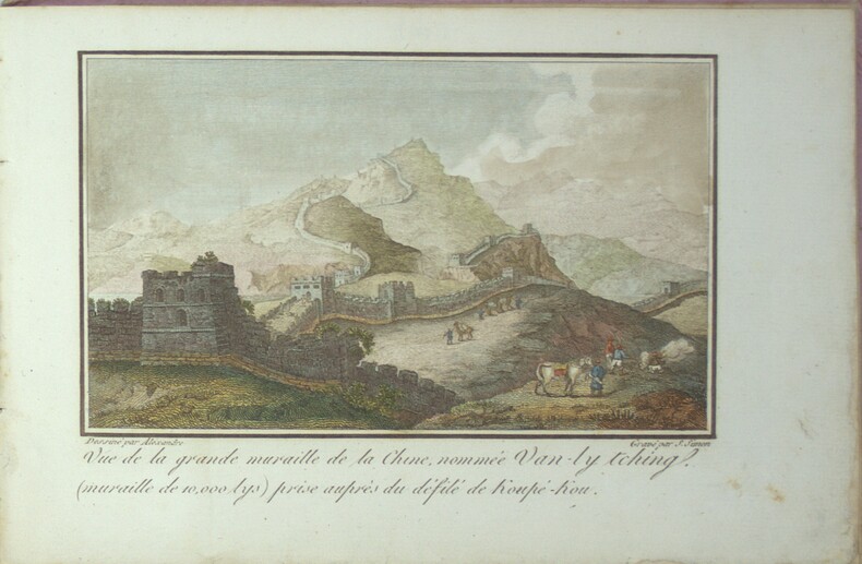 Second tome consacré aux paysages, bâtiments et autres, le premier volume comprenait les costumes et personnages. Illustré de 26 gravures, en couleurs d’époque, représentant des villes, villages, monuments et palais, comprenant une planche supplémentaire non comprise dans la liste, « Barques chinoises de l’Ambassade passant par une écluse sur le grand canal » En 1792, Alexander rejoignit l'ambassade britannique de Lord Macartney en Chine en tant que dessinateur. Bien que la mission diplomatique n'ait pas permis d'établir des relations commerciales durables avec l'empereur Qianlong, elle offrit à Alexander une documentation de première main exceptionnelle. À une époque où la chinoiserie fascinait l'Europe, ses aquarelles détaillées de paysages, d'architecture et de scènes de la vie quotidienne chinoises furent largement saluées. Nombre d'entre elles furent gravées pour les comptes rendus officiels de l'ambassade et pour des publications telles que « View of the Headlands, Islands, etc. » (1798) et « A Voyage to Cochin China » de John Barrow (1806). The illustrations in the two-volume China work are after the English painter, illustrator and engraver William Alexander, who travelled to China as draughtsman with Lord Macartney's Embassy to the Emperor in 1792-1794. M2-Et3