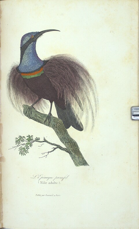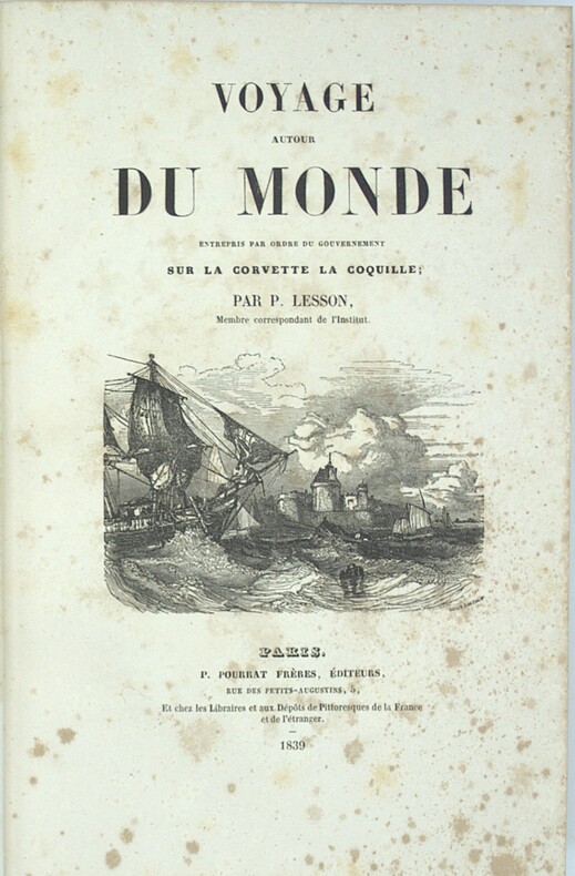 Lesson était le naturaliste de l'expédition scientifique dans le Pacifique commandée par Duperrey à bord de corvette La Coquille. Son récit, presque essentiellement consacré à l'Océanie, est d'autant plus précieux que l'histoire officielle du voyage est restée inachevée. René Primevère Lesson est un chirurgien, naturaliste, zoologiste et ornithologue français, il entre dans la l’école de médecine navale à 15 ans, participe aux guerres napoléoniennes comme chirurgien naval et s’occupe bénévolement du jardin botanique de Rochefort, son départ lors de l’expédition de la Coquille lui permet de se consacrer à l’ornithologie et aux oiseaux mouches dont il décrit plus de 110 espèces sur les 330 connues. M6-A Chadenat, n°625 - Sabin, n°40214.