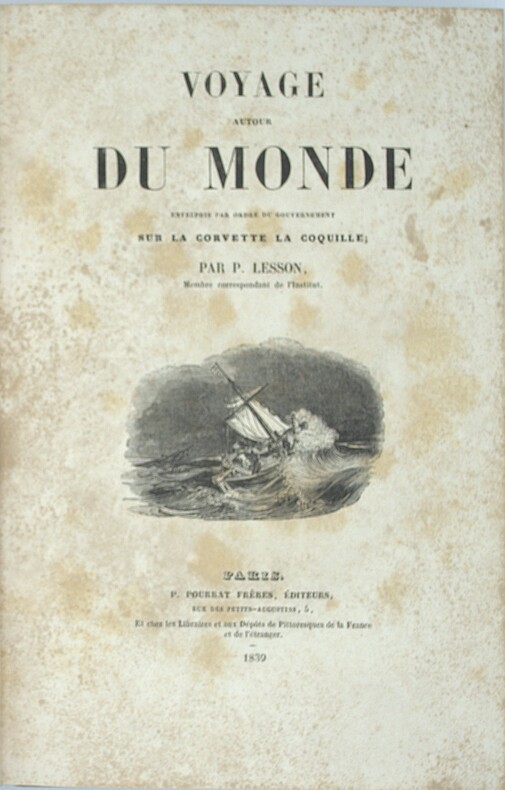 Lesson était le naturaliste de l'expédition scientifique dans le Pacifique commandée par Duperrey à bord de la corvette La Coquille. Son récit, presque entièrement consacré à l'Océanie, est d'autant plus précieux que l'histoire officielle du voyage est restée inachevée. Exemplaire bien complet du feuillet d'errata à la fin du tome II. René Primevère1 Lesson est un chirurgien, naturaliste, zoologiste et ornithologue français, né le 21 mars 1794 à Rochefort et mort le 28 avril 1849 dans cette même ville. . il entre dans l'école de médecine navale à 15 ans, participe aux guerres napoléonienne comme chirurgien naval et s'occupe bénévolement du jardin botanique de Rochefort, son départ lors de l'expédition de la Coquille lui permet de se sponsoriser à l' ornithologie et oiseaux aux mouches dont il décrit plus de 110 espèces sur les 330 connues. Borba de Moraes, t. Je, p. 408. - Chadenat , n°625. - Sabin, n°40214. P1-3J