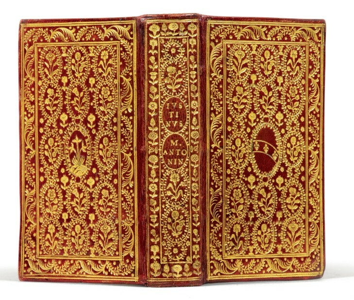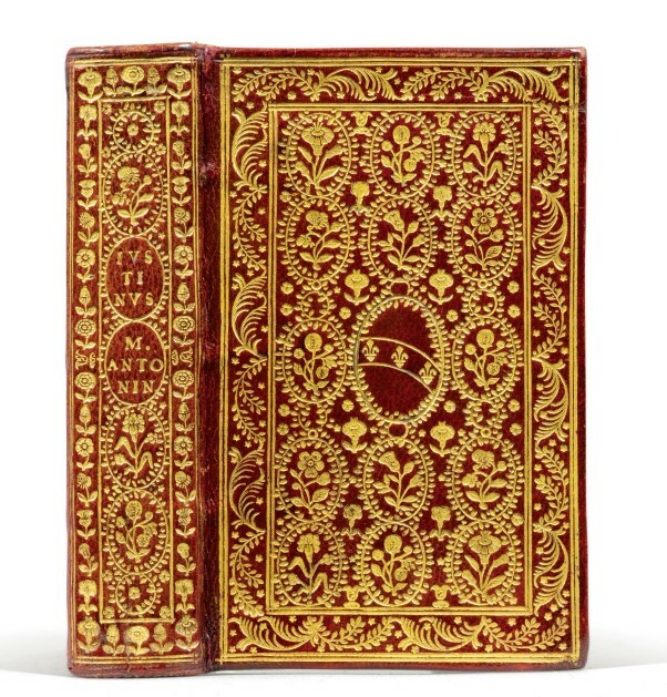 Jean de Tournes, Lyon, 1559. 221 pp. – 1. 1 f. blanc. Paris, Jérôme de Marnef (nom de l’imprimeur au colophon : Etienne Prévosteau), 1585. In-16, 210-(20) feuillets. Deux œuvres reliées en 1 volume in-16 plein maroquin rouge, plats ornés d'un décor à répétition de médaillons fleuris (chardons, lis au naturel, jonquille), bordure de palmes et de feuillages, armes poussées dans le médaillon central du premier plat, devise « Expectata non eludet » entourant un pied de lis à trois fleurs dans le médaillon central du second, dos lisse orné de même en long, deux médaillons avec titre poussé, filet sur les coupes, tranches dorées. Exemplaires réglés reliés ensemble aux armes et à la devise de Pierre Duodo (1554-1611), dans l'élégante reliure à médaillons fleuris, de Nicolas et Clovis Eve, relieurs du roi entre 1578 et 1634. 128 x 80 mm. PRECIEUSES ET RARES EDITIONS JEAN DE TOURNES DE 1559 ET JEROME DE MARNEF DE 1585. Ces volumes de Duodo demeurèrent ignorés pendant près de deux cents ans ; c'est à l'époque de la Révolution française qu'ils apparurent sur le marché de Londres avec l'attribution des armes à Marguerite de Valois, attribution précieusement gardée par les amateurs et les libraires jusqu'à la découverte de la vérité par le Dr Bouland en 1925. Parmi les grands bibliophiles anglais de l'époque, Gostling ne possédait pas moins de 36 Duodo, Thorold 12, Beckford 10 et le Rév. Cracherode 9. Raphaël Esmérian avait réuni trois œuvres de ce format reliées pour Duodo, à sa vente du 6 juin 1972, chacun de ces petits volumes fut adjugé près de 2 000 € il y a plus de 50 ans (environ 12 500 FF de l’époque).