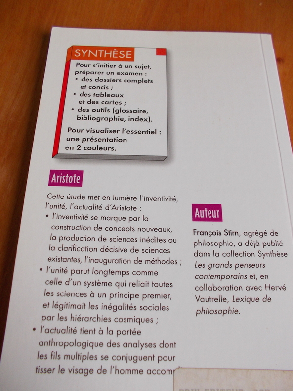 Introduction à Aristote, suivant 3 "parcours": "le parcours de vie de l'homme Aristote dans la société grecque du IVè siècle avant [J.-C.]"; un 2è ayant "comme fil conducteur la signification aristotélicienne de l'acte de connaître"; et un 3è qui "prend son départ chez Aristote et suit certaines traces que sa réflexion éthico-politique a laissées dans l'histoire de la pensée occidentale", par le philosophe Alfredo GOMEZ-MULLER, cofondateur de la revue internationale de philosophie "Concordia"; notes et références; bibliographie. 1ère édition (et non livre de poche).