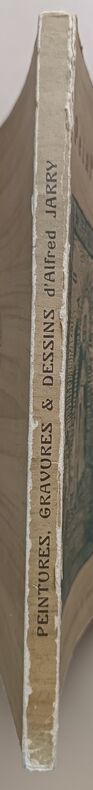 Paris, éd. Collège de 'Pataphysique, 8 merdre 95 - 25 mai 1968, EDITION ORIGINALE expl. n° 280/1777 sur papier glacé marqué d'un hibou de gueules en violet, pt. in-4 carré (21 x 21 cm), cartonnage souple br., couv. texte en bordeaux et dessins en mauve sur fond imitation de bois éd., 125 - (7) pp. sur papier glacé, ill. de 82 planches dont 1 dépliable, nb. photos en noir, préface et commentaires des œuvres par Michel Arrivé, table commentée des œuvres reproduites, liste des œuvres connues qui ne figurant pas dans ce recueil, bibliographie, Superbe "cahier" de la plupart des peintures, gravures et dessin d'Alfred Jarry, le créateur de la 'Pataphysique. Très bon commentaires de Michel Arrivé, lui-même pataphysicien. RARE. Très bon état; les coiffes sont très légèrement défraîchie. Minuscule petits retraits de papier (quelques milimètres) sur la première de couverture. Coins de la couverture et des pages avec petite pliure.
