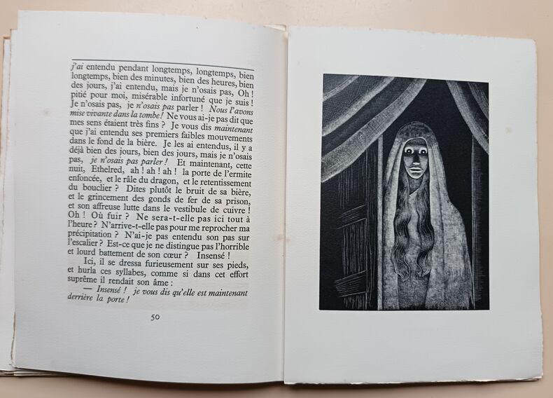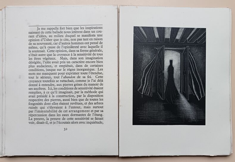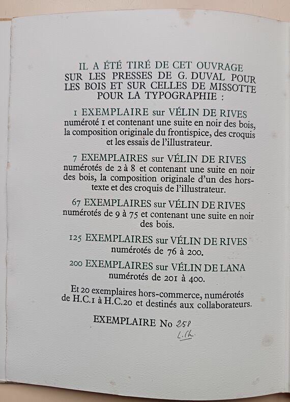 Ed. Le Jaquemart, 1947, 53pp, in-4. Bon état. En feuilles, sous chemise et emboîtage. (Traces d'usure, bord supérieur de l'emboîtage fendu). Intérieur frais. (Légères rousseurs éparses sans conséquence sur la lecture). Sans annotations ni phrases/illustrations soulignées. Voir photos. Un des 200 exemplaires sur Vélin de Lana, celui-ci N°258.