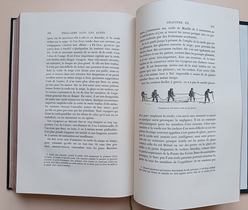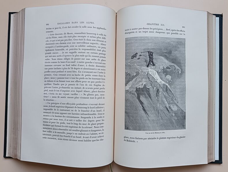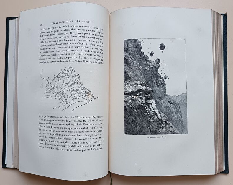 Paris, (Lahure à Paris pour) Hachette, 1873. 27,5 x 19,5 cm, 3 ff., iv et 431 pp., illustré de 108 gravures sur bois à pleine page plus une planche de croquis (Cervin, avec hachure en rouge) et cinq (dont trois doubles) cartes dont 4 en couleurs. Relié demi chagrin vert, dos à nerfs, caissons ornés, titre doré, toutes tranches dorées. Reliure légèrement usée avec des traces de frottements, des rousseurs sinon bon exemplaire. Première édition en français de de ce classique de la montagne. C'est la relation des escalades d'Edouard Whymper, surtout au Mont-Cervin, avec de nombreuses illustrations dessinées par l'auteur.