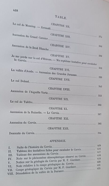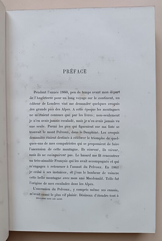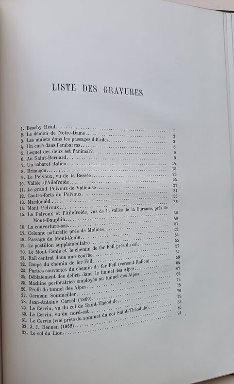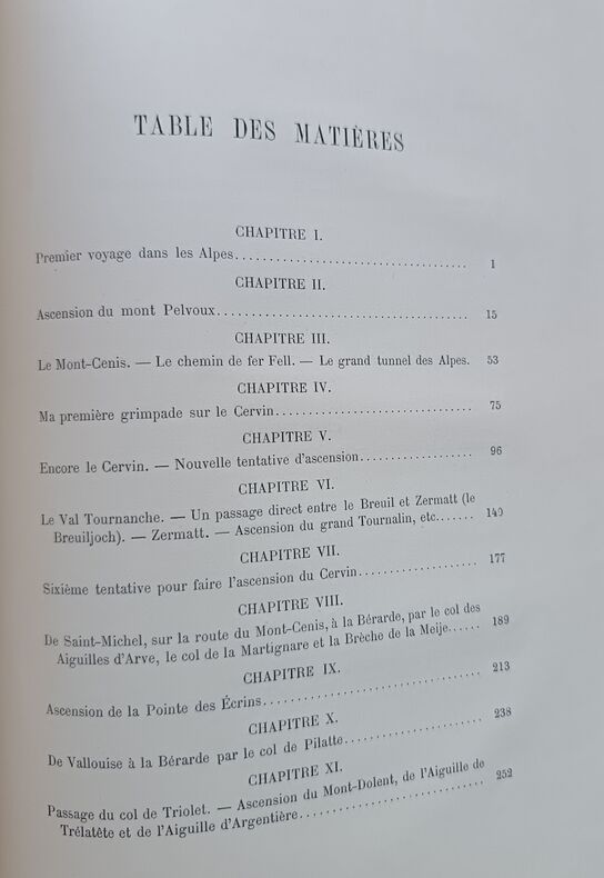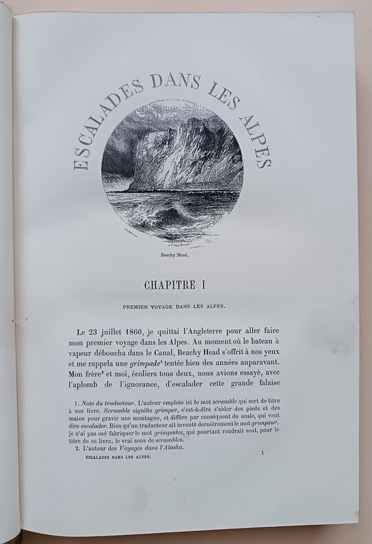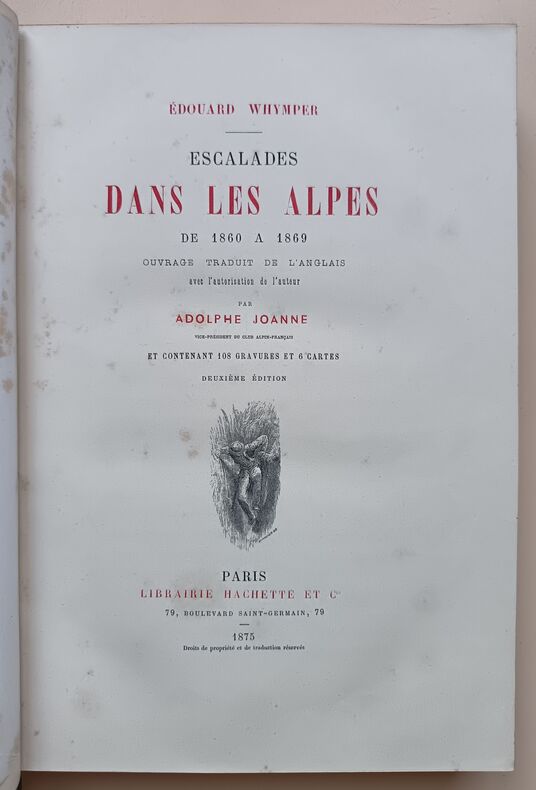 Première édition en français de de ce classique de la montagne. C'est la relation des escalades d'Edouard Whymper, surtout au Mont-Cervin, avec de nombreuses illustrations gravées de l'auteur. Traduction de «Scrambles amongst the Alps in the years 1860-69», London 1871. Perret 4557. Image disp.