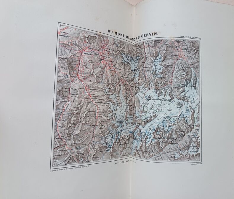 Paris, (Lahure à Paris pour) Hachette, 1873, in-4°, 3 ff., titre en rouge et noir + IV + 431 p., illustré de 108 gravures sur bois partiel. à pleine page + 1 planche de croquis (Cervin, avec hachure en rouge) + 5 (3 doubles) cartes dont 4 en coul., qqs lég. rousseurs dans p. 181-186, autrement très frais, gardes en papier marbré, exlibris Peter E. Obergfell, reliure en demi-cuir à nerfs, dos orné, tranches dorées, très bel exemplaire.