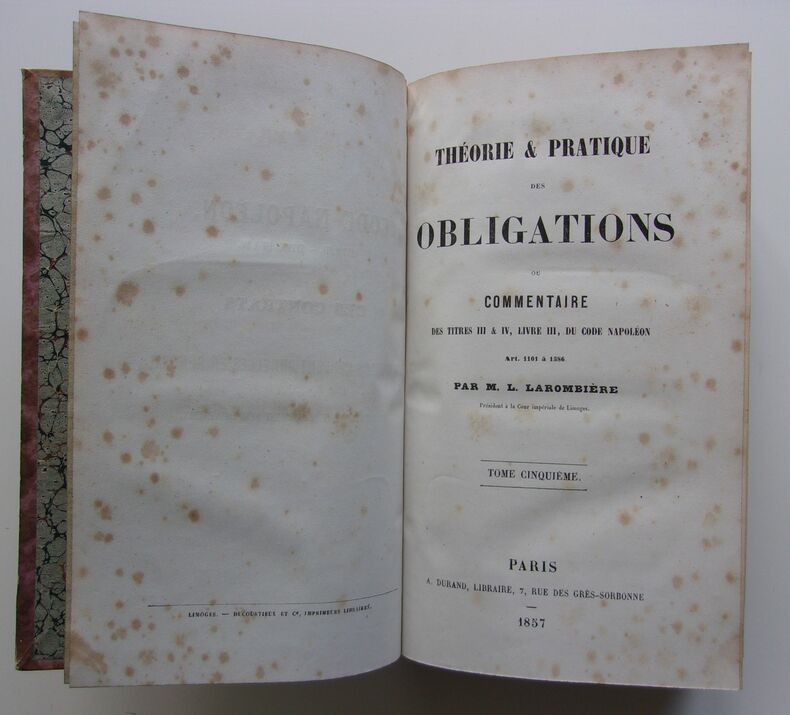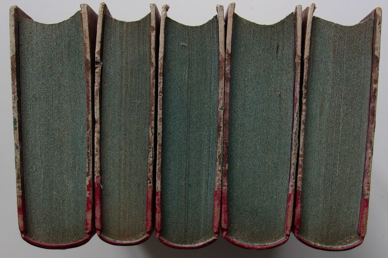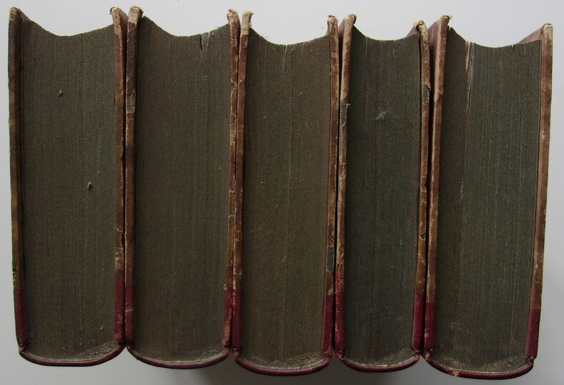 Ed A. Durand, Librairie, Paris, 1857, 783-802-753-674-847pp. In-8. Reliure demi-cuir rouge, dos avec titrage, tomaisons & filets dorés, plats marbrés cartonnés (épidermures & usures des dos et des plats voir photos, coins émoussés (coin supérieur droit du tome IV plié et en partie déchiré), tranches colorées (bleutées), intérieur frais (nombreuses rousseurs ne gênant pas la lecture). Rare édition complète.