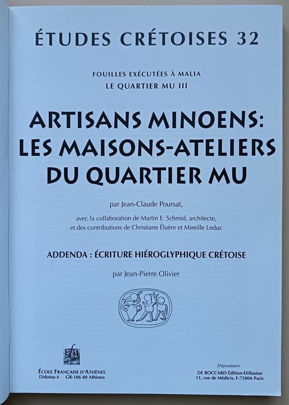 Ed. Ecole Français d'Athènes (efa), Coll. "Etudes crétoises n°32", 1996, 218pp + 81 planches, In-4. Très bon état. Couverture souple illustrée éditeur. (Très légères traces d'usage). Intérieur impeccable. Sans annotations ni phrases/illustrations soulignées. Voir photos.