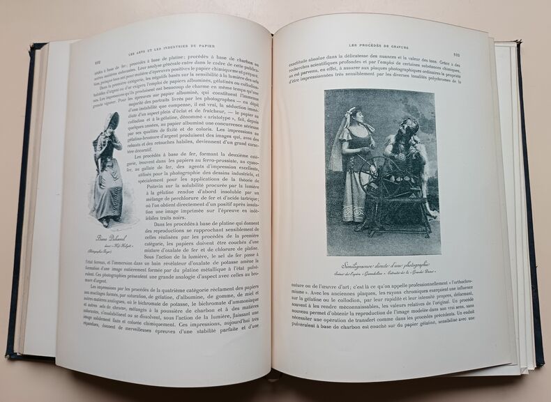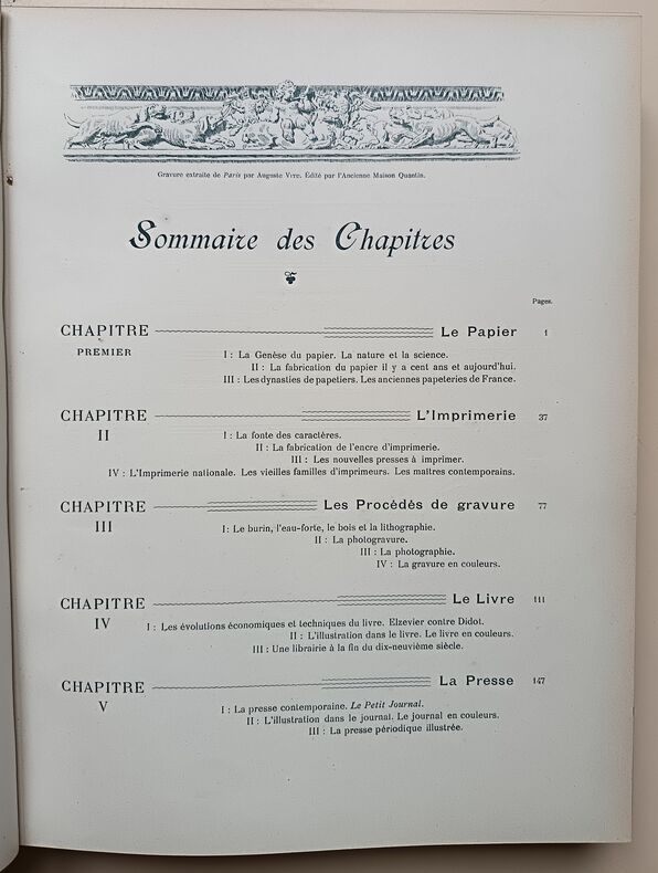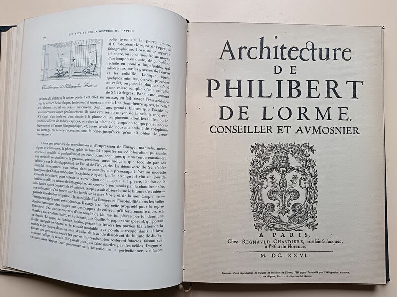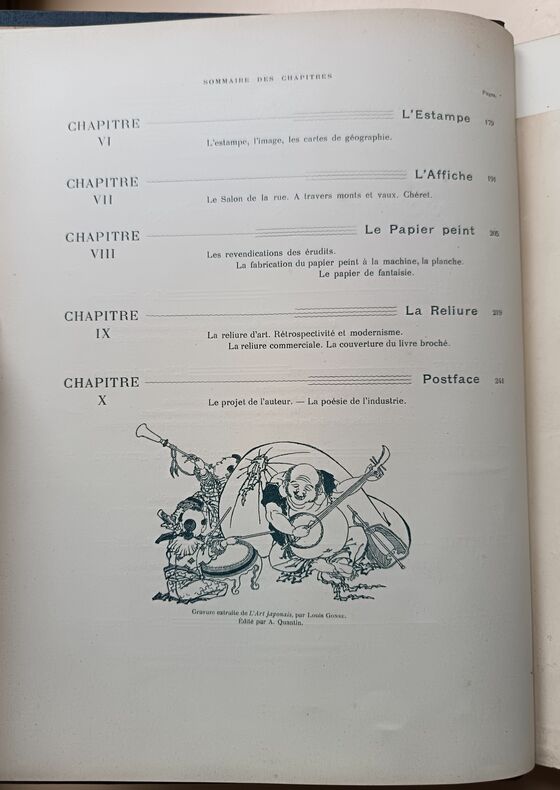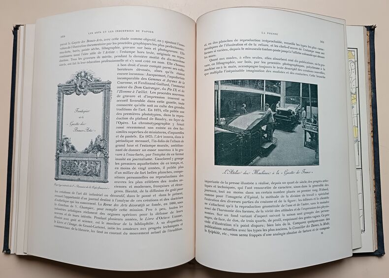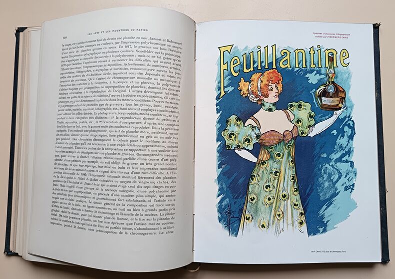 In 4° (32,3 x 25,5), demi-reliure de relieur en chagrin vert, plats marbrés, dos à 5 nerfs, lettrage doré, 246pp, nombreuses illustrations ( photos, gravures et dessins) in et hors texte, en noir et blanc et en couleurs.9 chapitres techniques (Le Papier, L'Imprimerie, Les Procédés de gravure, Le Livre, La Presse, L'Estampe, L'Affiche, Le Papier peint, La Reliure) terminés par un dixième: la poèsie de l’industrie... Il s’agit d’un grand ouvrage de référence, rassemblant toutes les connaissances sur le sujet en son temps avec un ton personnel et passionné rare.Très bel état, sans rousseurs, papier spécialement fabriqué pour cet ouvrage [251]