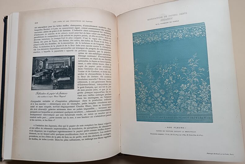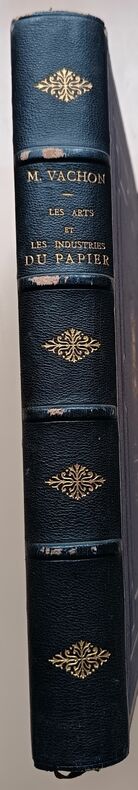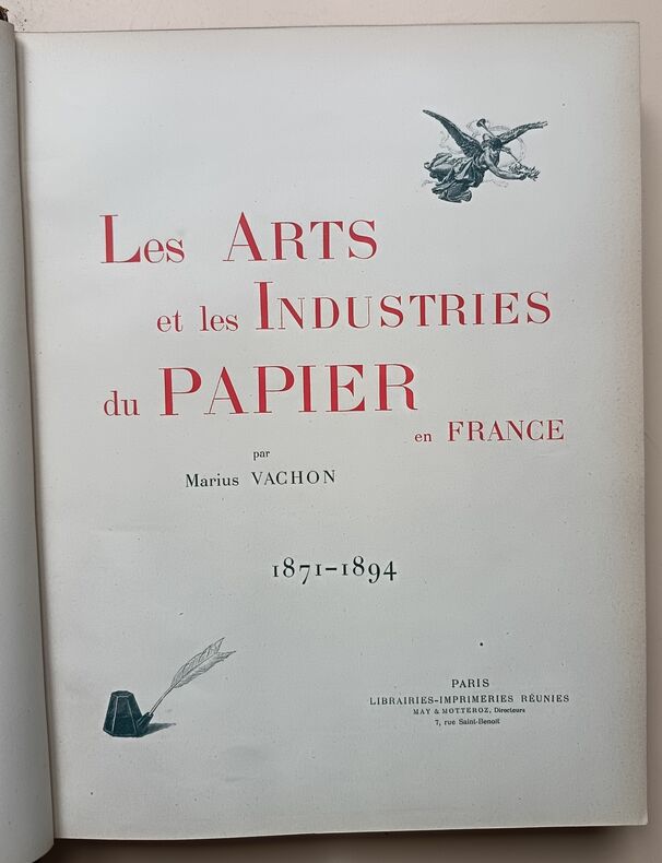 VACHON (Marius)Les Arts et les Industries du papier en France 1871-1894Paris, Librairies-Imprimeries Réunies, May et Motteroz, 1894. In-4° reliure (33 x 26 cm), reliure demi-chagrin, usures en coins, 246 pages, un petit manque en coin d'un feuillet, planches h-t. alliant les principaux procédés de reproduction dont certaines en couleur, très nombreuses illustrations dans le texte. tirées à plusieurs tons (vues d'ateliers principalement), couv. illustrées & dos conservés, intérieur frais.L'industrie du papier, l'imprimerie, les procédés de gravure, le livre, la presse, l'estampe, l'affiche, le papier peint et la reliure. Illustrations photographiques des ateliers de Firmin-Didot, Vacquerel, Paul Dupont, Lefranc, Chaix, Berger-Levrault, Delagrave, Lenègre, Charles-Lavauzelle.