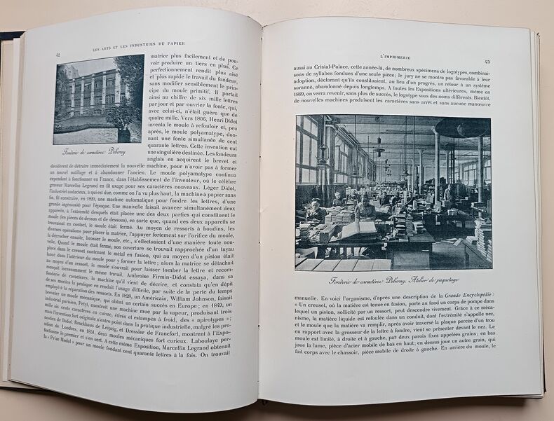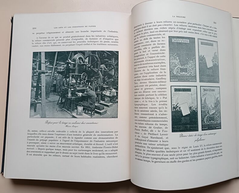 Bel ouvrage en 9 chapitres techniques (Le Papier, L'Imprimerie, Les Procédés de gravure, Le Livre, La Presse, L'Estampe, L'Affiche, Le Papier peint, La Reliure) terminés par un dixième: la poèsie de l'industrie.... Illustrations photographiques des ateliers de Firmin-Didot, Vacquerel, Paul Dupont, Lefranc, Chaix, Berger-Levrault, Delagrave, Lenègre, Charles-Lavauzelle..... Il s'agit d'un grand ouvrage de référence, rassemblant toutes les connaissances sur le sujet en son temps avec un ton personnel et passionné .....Très bel état, sans rousseurs, papier spécialement fabriqué pour cet ouvrage TRES RARE ...... Superbe ouvrage en EDITION ORIGINALE.....intérieur très frais, et reliure soignée.......en trés bon état(very good condition). en trés bon état