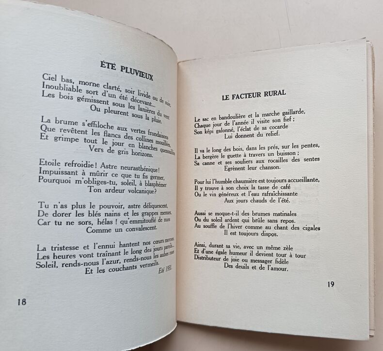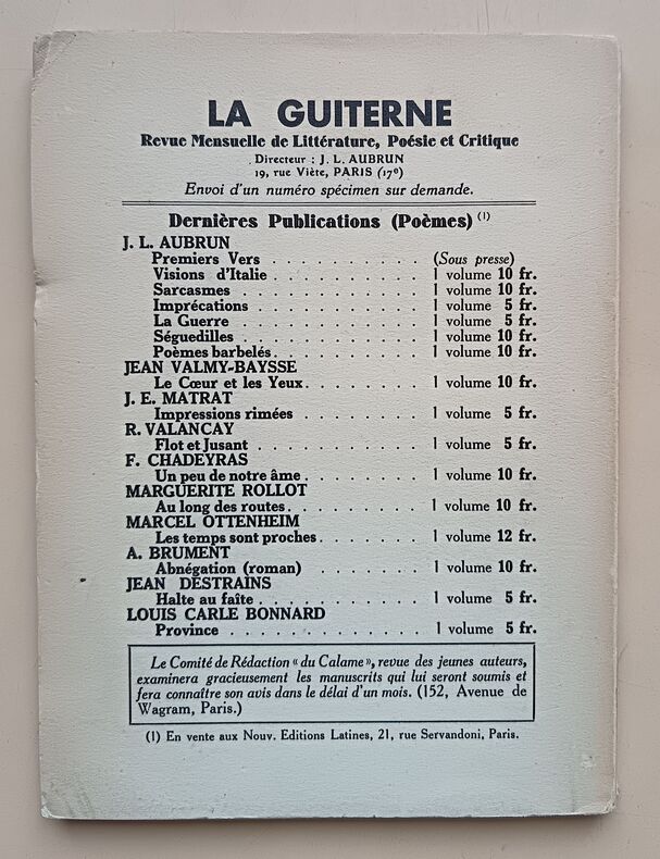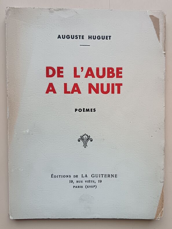 Éditions de la Guiterne, non daté, 63pp, In-12. Bon état. Couverture souple éditeur. (Traces d’usure, dos insolé, mors fendu, manque au coin droit supérieur). Intérieur propre et frais. Envoi de l’auteur en page de faux-titre, sinon, sans annotations ni phrases/illustrations soulignées. Voir photos. Papier Alfa-Mousse Navarre.