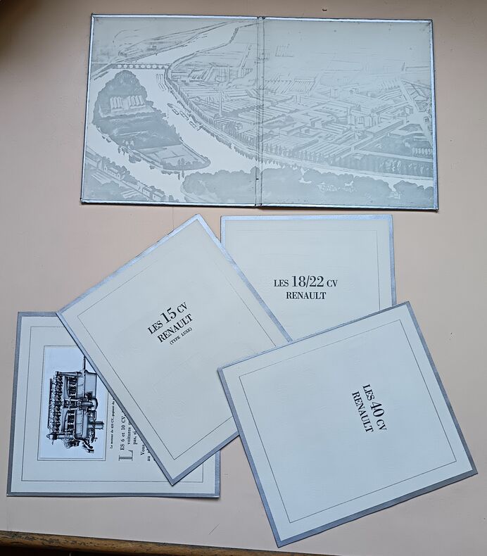 Ed. Imprimerie Draeger, non daté (vers 1926), non paginé, In-4. Catalogue publicitaire présentant de superbes illustrations de véhicules Renault par Draeger, 4 feuillets, sous chemise cartonnée. Dos de la chemise abîmé, rousseurs sur les deux plats. Intérieur extrêmement frais et propre, exempt de rousseurs. Très rare catalogue.