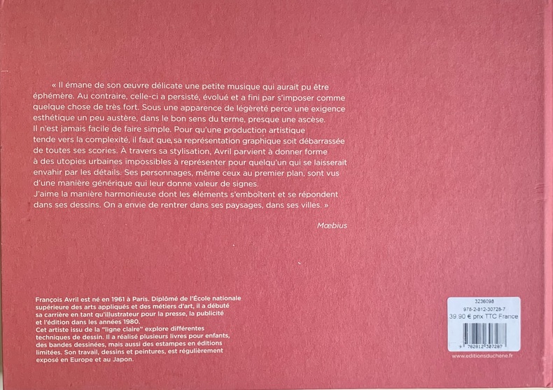 Ed. Éditions du Chêne, 2012, 254pp. In-folio (format à l'italienne). Très bon état, couverture cartonnée illustrée éditeur (présentant quelques légères salissures, un tout petit enfoncement sur le plat du dessus), intérieur très propre. Bel exemplaire. "Explorant tour à tour l'acrylique, les encres, la mine de plomb ou les crayons de couleurs, les illustrations de François Avril gardent toujours leur élégante légèreté. Paysages de campagne ou falaises bretonnes, villes patchwork, le dessinateur mêle rêve et réalité, il réinvente Paris, New York, Bruxelles ou encore Tokyo. Soigneusement sélectionnées par l'artiste, les ouvres de ce sublime ouvrage invitent le spectateur à une promenade fascinante, guidé parfois par une silhouette fine et gracieuse." (note de l'éditeur)