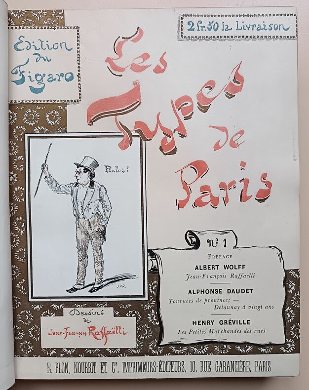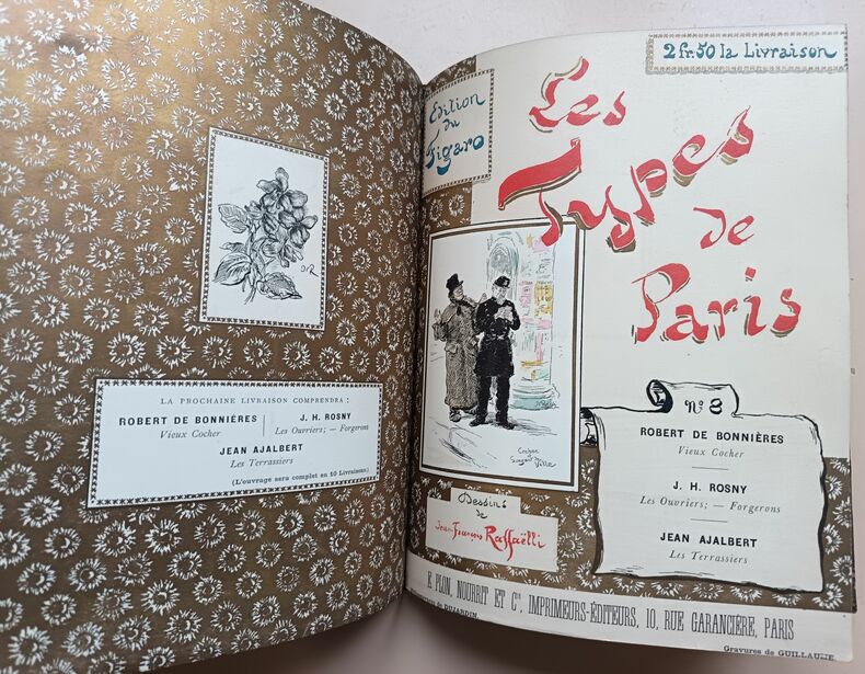 Héliogravures de Dujardin. Gravure de Guillaume. Paris, Plon, sans date. Soit 10 livraisons in-4 brochés, couvertures illustrées en couleurs et personnalisées.VII,160pp (pagination continue). Livraisons : N°1 - Préface Albert Wolff : Jean-François Raffaëli - Alphonse Daudet : Tournées de Province;- Delaunay à vingt ans - Gréville Henry : Les petits marchands de rues. N°2 - Emile Zola: Bohèmes Villégiature - Gustave Geoffroy: La rue qui chante. N°3 - Guy de Maupassant: Servantes; Rubans et Tabliers - Antonin Proust: Paris et les étrangers. N°4 - Edmond de Goncourt: Une promenade au Boulevard Beaumarchais - Paul Bonnetain: Les Enfants. N°5 - Jean Richepin: Types des fêtes Forains - Henry Céard: Les Comédiens. N°6 - Octave Mirbeau: Cocher de Maître - Roger Max: Dimanches de Paris. N°7 - Paul Bourget: Professeur Libre - Stéphane Mallarmé: Types de la Rue. N° 8 - Robert de Bonnières: Vieux Cocher - J.-H. Rosny: Les Ouvriers; - Forgerons - Jean Ajalbert : Les Terrassiers. N°9 - L. de Fourcaud: Belles filles - Félicien Champsaur: Les Chiffonniers. N°10 - J.-K. Huÿsmans: Les habitués de café - Louis Mullen: Les Petits Gens des Maisons de Retraite. Collection complète en 10 livraisons, minimes rousseurs et petits accros sur quelques couvertures. Bon état