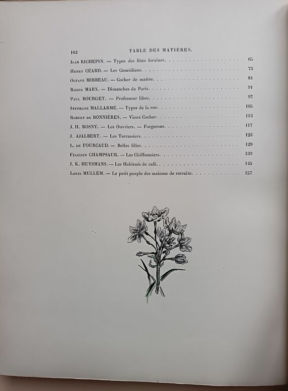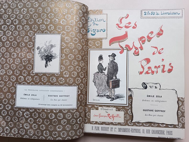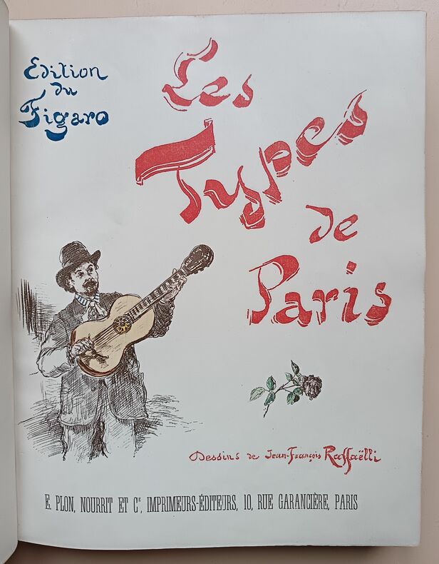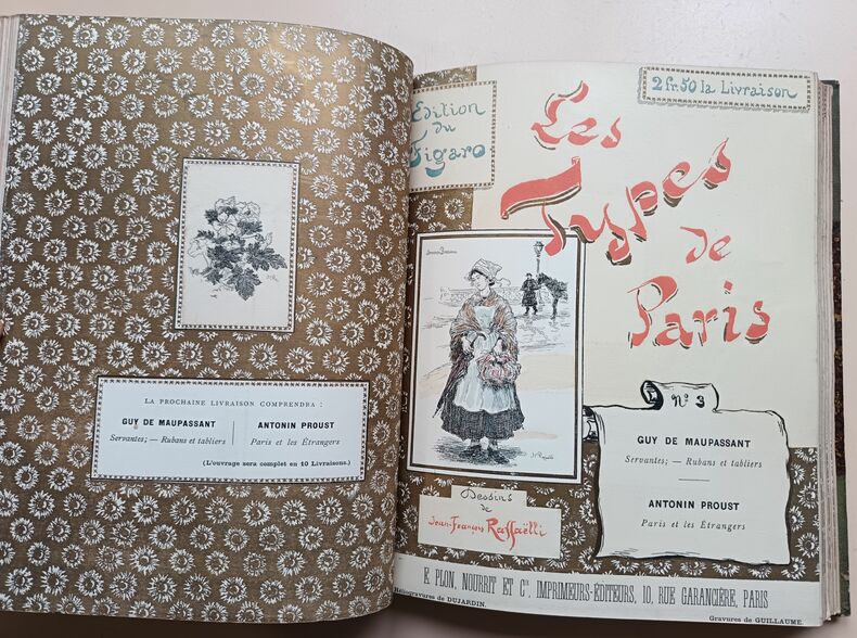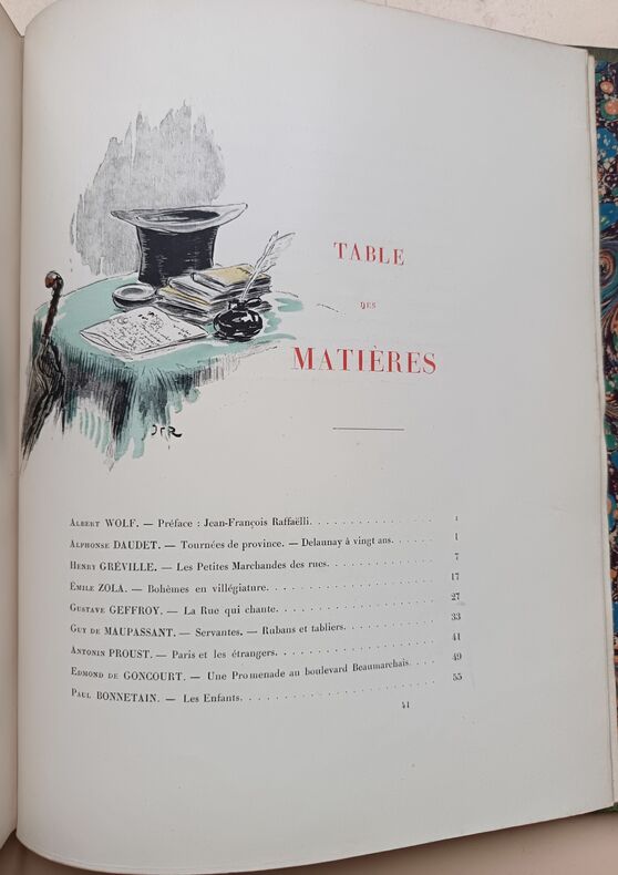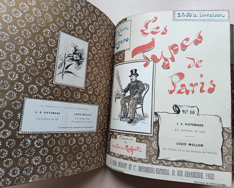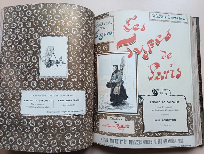 Paris, Plon-Nourrit et Cie, 1899, in-4, demi-bradel, pièce de titre, VII, 160 pages. Edition du Figaro. 10 livraisons reliées en un volume. Seule la couverture de la première livraison est conservée. Abondamment illustré de vignettes & de planches en noir et en couleurs. 1: Albert Wolff (préface), Tournées de Province - Delaunay à vingt ans par Alphonse Daudet. Les petites marchandes des rues par Henry Gréville. 2: Bohèmes en villégiature par Émile Zola. La rue qui chante par Gustave Geffroy. 3: Servantes, rubans et tabliers par Guy de Maupassant. Paris et les étrangers par Antonin Proust. 4: Une promenade au Boulevard Beaumarchais par Edmond de Goncourt. Les enfants par Paul Bonnetain. 5: Types des Fêtes Foraines par Jean Richepin. Les comédiens par Henry Céard. 6: Cocher de Maître par Octave Mirbeau. Dimanches de Paris par Roger Marx. 7: Professeur libres par Paul Bourget. Types de la rue par Stéphane Mallarmé. 8: Vieux cochers par Robert de Bonnières. Les ouvriers par J.H. Rosny. Les terrassiers par Jean Ajalbert. 9: Belles filles par L. de Fourcaud. Les chiffoniers par Félicien Champsaur. 10: Les habitués de café par J.K . Huysman. Le petit peuple des maisons de retraite par Louis Mullen.