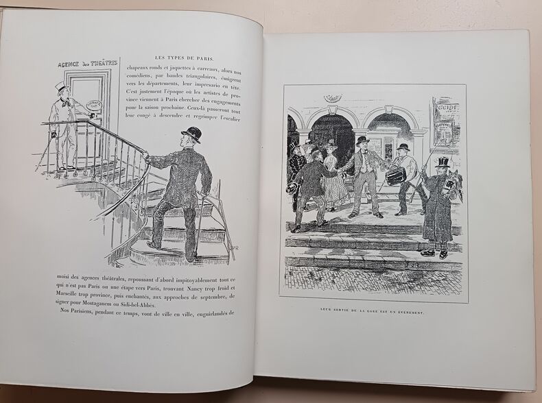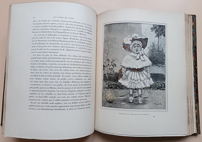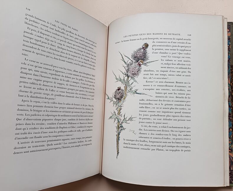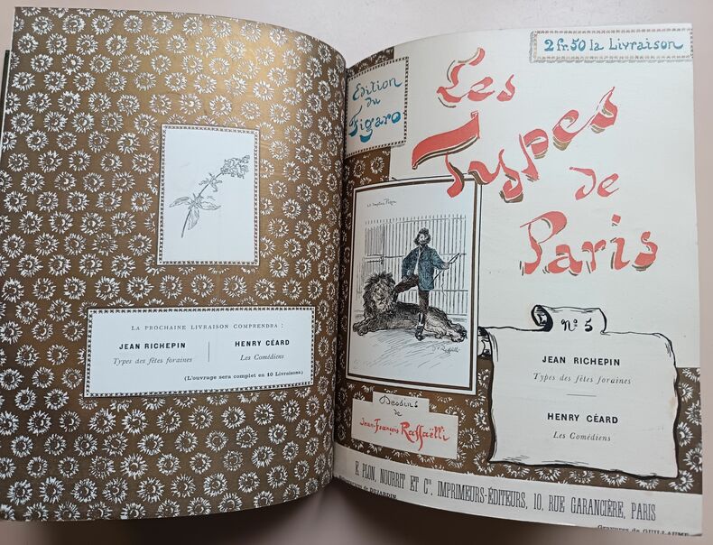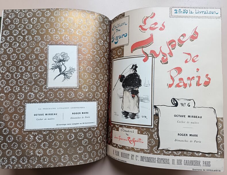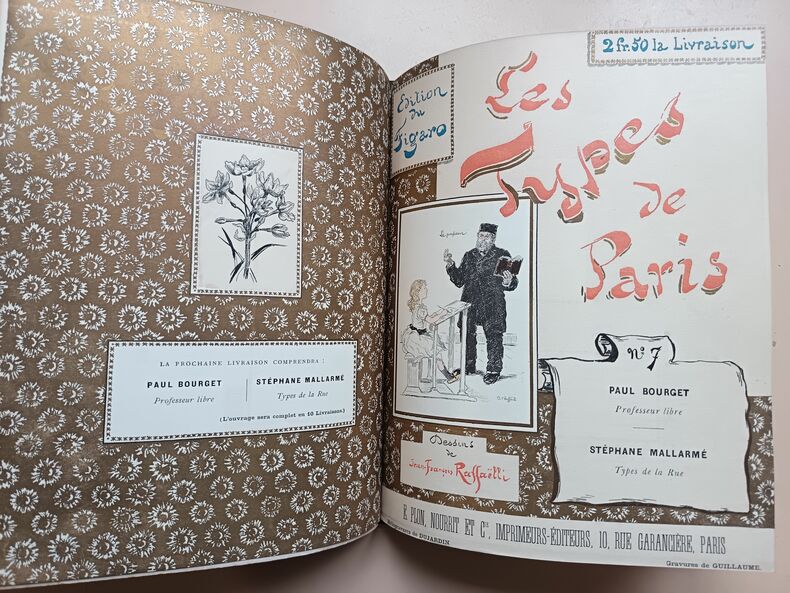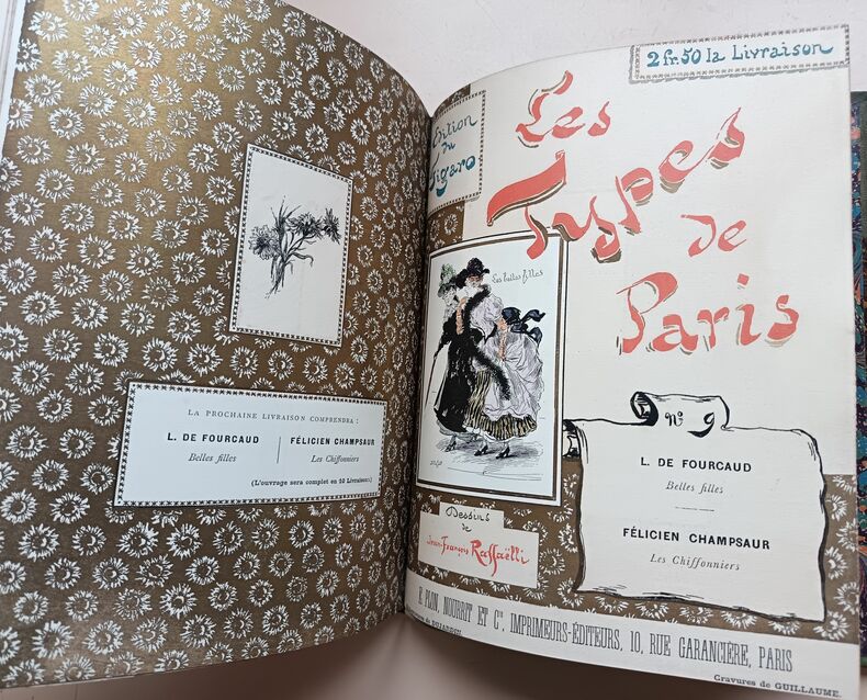 Paris, Plon-Nourrit et Cie, 1899, in-4, demi-bradel, pièce de titre, VII, 160 pages. Edition du Figaro. 10 livraisons reliées en un volume. Seule la couverture de la première livraison est conservée. Abondamment illustré de vignettes & de planches en noir et en couleurs. 1: Albert Wolff (préface), Tournées de Province - Delaunay à vingt ans par Alphonse Daudet. Les petites marchandes des rues par Henry Gréville. 2: Bohèmes en villégiature par Émile Zola. La rue qui chante par Gustave Geffroy. 3: Servantes, rubans et tabliers par Guy de Maupassant. Paris et les étrangers par Antonin Proust. 4: Une promenade au Boulevard Beaumarchais par Edmond de Goncourt. Les enfants par Paul Bonnetain. 5: Types des Fêtes Foraines par Jean Richepin. Les comédiens par Henry Céard. 6: Cocher de Maître par Octave Mirbeau. Dimanches de Paris par Roger Marx. 7: Professeur libres par Paul Bourget. Types de la rue par Stéphane Mallarmé. 8: Vieux cochers par Robert de Bonnières. Les ouvriers par J.H. Rosny. Les terrassiers par Jean Ajalbert. 9: Belles filles par L. de Fourcaud. Les chiffoniers par Félicien Champsaur. 10: Les habitués de café par J.K . Huysman. Le petit peuple des maisons de retraite par Louis Mullen.