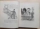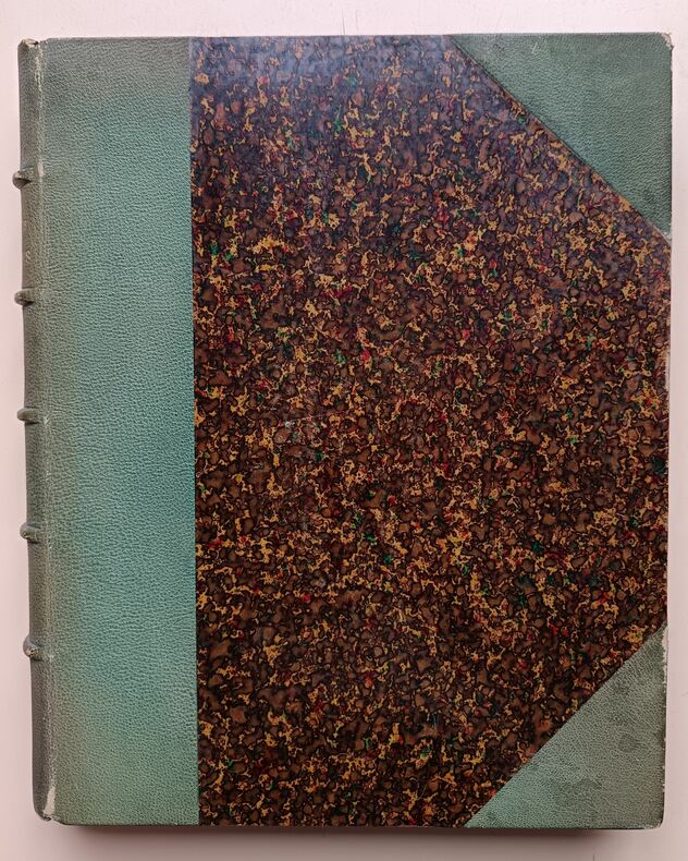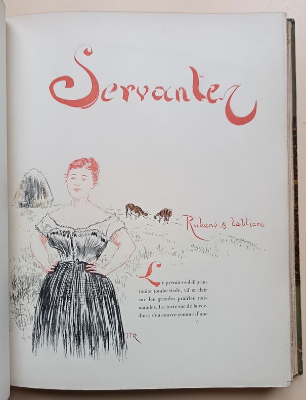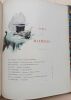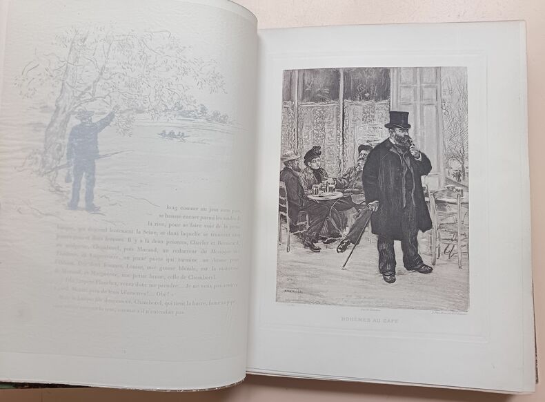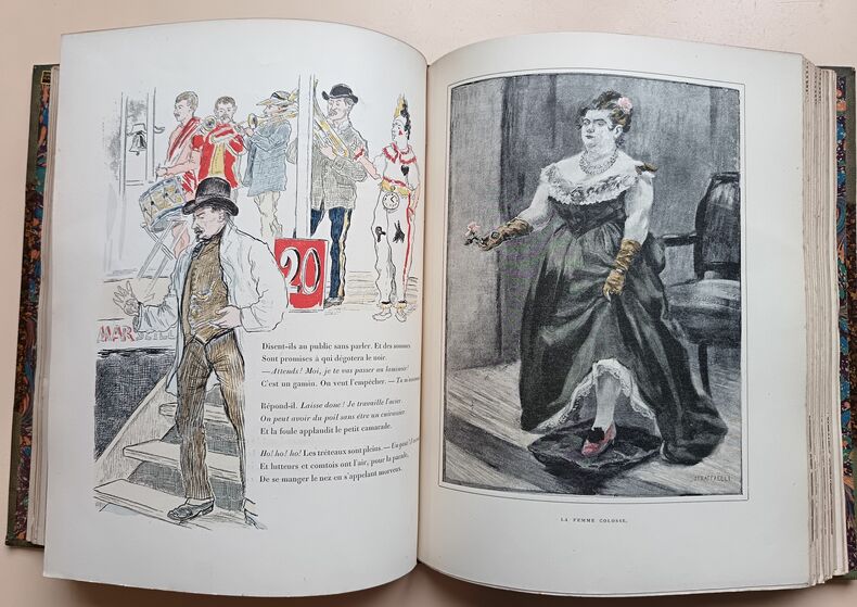 Bel exemplaire relié bradel (290x230mm), demi-percaline verte à coins, titre et fleuron dorés au dos, (vii), 162pages, couvertures conservées. Après le texte de présentation d'Albert Wolf sur le peintre Raffaëlli (1850-1924), sont réunis une vingtaine de textes d'auteurs reconnus : Jean Richepin (Types des fêtes foraines), J.K. Huysmans (Les Habitués de café), J.H. Rosny (Les Ouvriers-Forgerons), O. Mirbeau (Cocher de maître), S. Mallarmé (Types de la rue), autant de portraits d'hommes et de femmes du commun. Guy de Maupassant signe un texte sur les servantes, Émile Zola sur la bohème. Mise en page soignée des illustrations en couleurs et en noir du portraitiste Jean-François Raffaelli qui, avec beaucoup de réalisme, s'attache à mettre en valeur la vie des gens de la banlieue parisienne. On lui doit aussi de remarquables paysages parisiens -des fortifications- et des estampes en couleurs de grandes qualité. Raffaëlli collabora avec Forain à l'illustration du texte de Huysmans : Croquis parisien (Benezit). '' Elles vont, la fille devant, la bête derrière, la fille traînant, la bête traînée, l'une pressée et l'autre lente, n'ayant l'une et l'autre au fond des yeux que les reflets verts des arbres et des herbes''. Guy de Maupassant, Servantes. Exemplaire en très bon état.