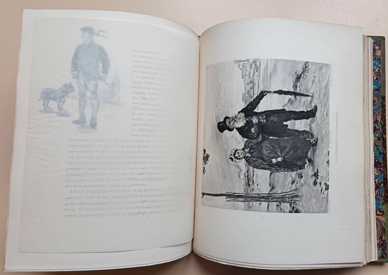 Paris, Edition du Figaro, Plon, Nourrit et Cie, 1889. Un volume in-4 composé de 10 livraisons. Faux-titre au V° justification du tirage, VII pages (présentation de J.F. Raffaëlli par Albert Wolf), 162 pages et un achevé d'imprimer. Lillustration se compose de 178 dessins dont 78 coloriés répartis dans les marges, le texte ou à pleine page, 10 compositions hors texte sont reproduites en héliogravures, le reste au trait ou en zincographie (9 hors-texte en couleurs à pleine page et 9 hors-texte en noir) . Edition originale. Pâles et rares rousseurs sur le titre et quelques rousseurs en angle inférieur des deux denières pages. Sinon excellent état intérieur. Demi-chagrin à coins bordeaux, contemporain, dos à cinq berfs, titre or et fleuron doré. Couverture générale illustrée conservée. Excellent état.