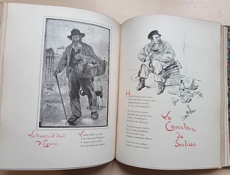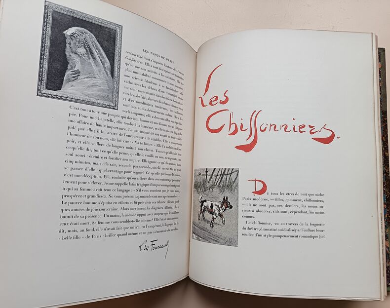 Paris, Edition du Figaro, 1899, in-4, cartonnage éditeur en soie rouge ploychrome, VII, 160 pages. Cartonnage défraîchi, soie très fragile présentant des manques. Rousseurs. 10 livraisons reliées en un volume. Seule la couverture de la première livraison est conservée. Abondamment illustré de vignettes & de planches en noir et en couleurs. 1: Albert Wolff (préface). Tournées de Province - Delaunay à vingt ans, par Alphonse Daudet. Les petites marchandes des rues, par Henry Gréville. 2. Bohèmes en villégiature, par Émile Zola. La rue qui chante, par Gustave Geffroy. 3. Servantes, rubans et tabliers, par Guy de Maupassant. Paris et les étrangers, par Antonin Proust. 4. Une promenade au Boulevard Beaumarchais, par Edmond de Goncourt. Les enfants par Paul Bonnetain. 5. Types des Fêtes Foraines, par Jean Richepin. Les comédiens, par Henry Céard. 6. Cocher de Maître, par Octave Mirbeau. Dimanches de Paris, par Roger Marx. 7. Professeur libre, par Paul Bourget. Types de la rue, par Stéphane Mallarmé. 8. Vieux cochers, par Robert de Bonnières. Les ouvriers, par J.H. Rosny. Les terrassiers, par Jean Ajalbert. 9. Belles filles, par L. de Fourcaud. Les chiffonniers, par Félicien Champsaur. 10. Les habitués de café par, J.K . Huysmans. Le petit peuple des maisons de retraite, par Louis Mullen.