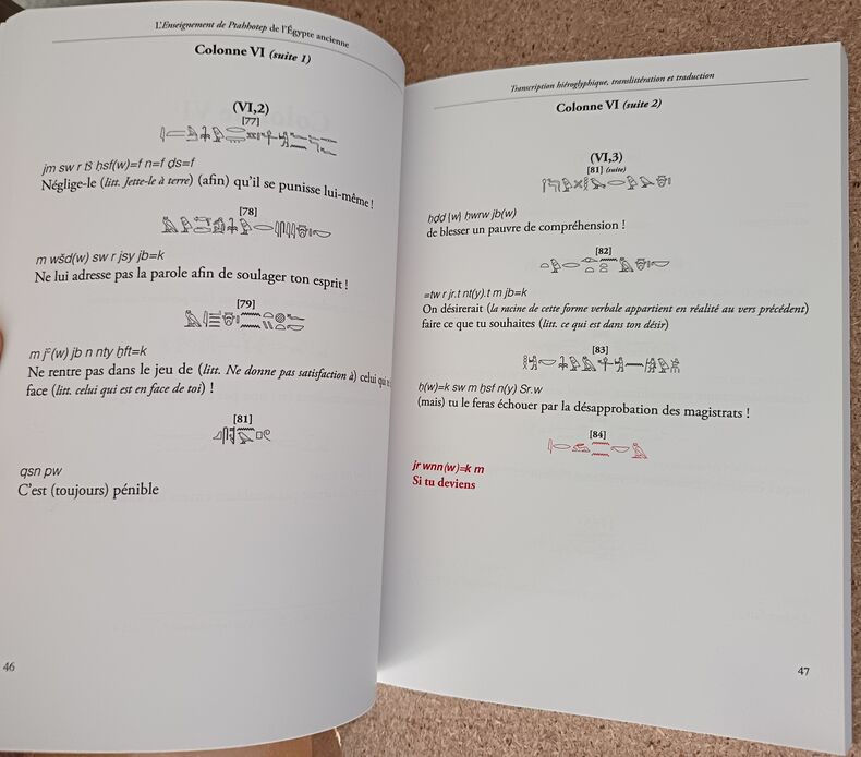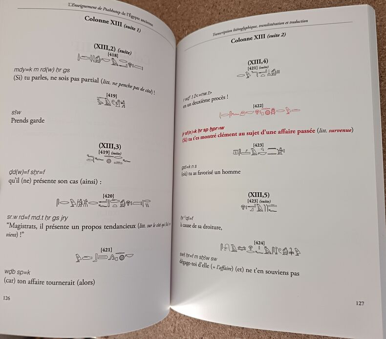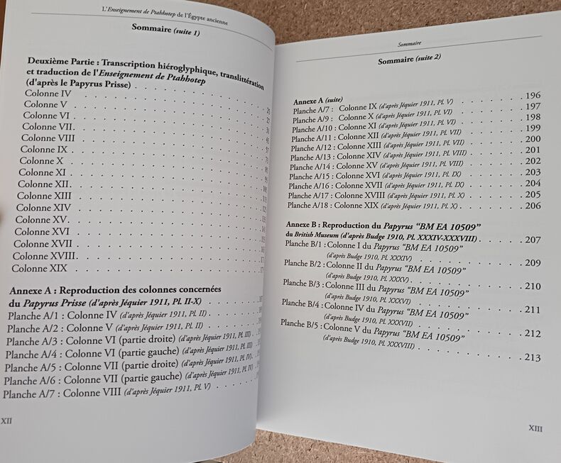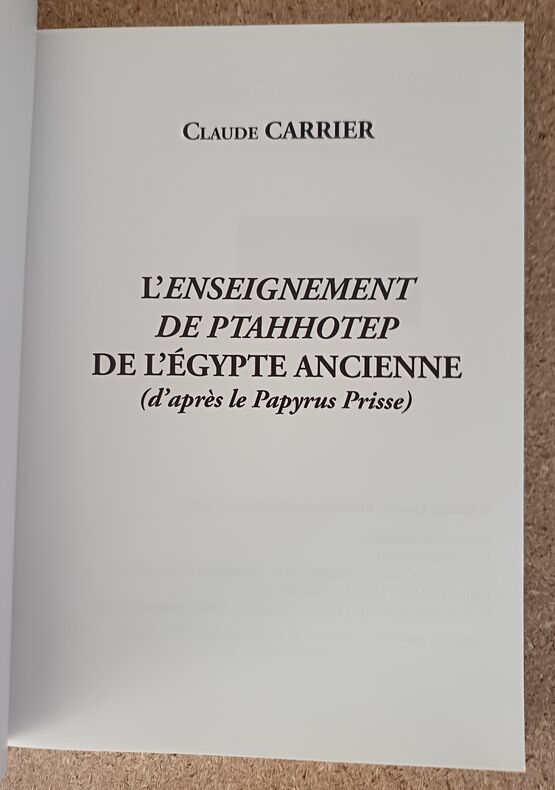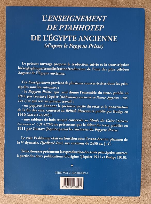 <p>Le présent ouvrage propose la traduction suivie et la transcription hiéroglyphique/translittération/traduction de l'une des plus célèbres "Sagesses" de l'Egypte ancienne.</p><p>Cet "Enseignement" provient de plusieurs sources écrites dont les principales sont les suivantes:<br>- le "Papyrus Prisse", qui seul donne l'ensemble du texte, publié en 1911 par Gustave Jéquier (Bibliothèque nationale de France, égyptien "186-194") et qui sert au présent travail;<br>- un papyrus donnant la première partie du texte et la ponctuation de la fin des vers, conservé au British Museum et publié par Budge en 1910 (BM EA 10,509);<br>- une tablette de bois stuqué conservée au Musée du Caire (Tablette Carnavon n°1, JE 41790) ne présentant que le début du texte, publiée en 1911 par Gustave Jéquier parmi les "Variantes du Papyrus Prisse".</p><p>Le vizir Ptahhotep était en fonction sous l'avant-dernier pharaon de la Ve dynastie, "Djedkarê-Isesi, aux environs de 2430 av. J.-C.</p><p>Trois "Annexes" présentent la reproduction des trios principales sources à partir des deux publications d'origine (Jéquier 1911 et Budge 1910).</p> Brest, 2016 217 p., planches de fac-similé, transcription, broché. 17,5 x 24