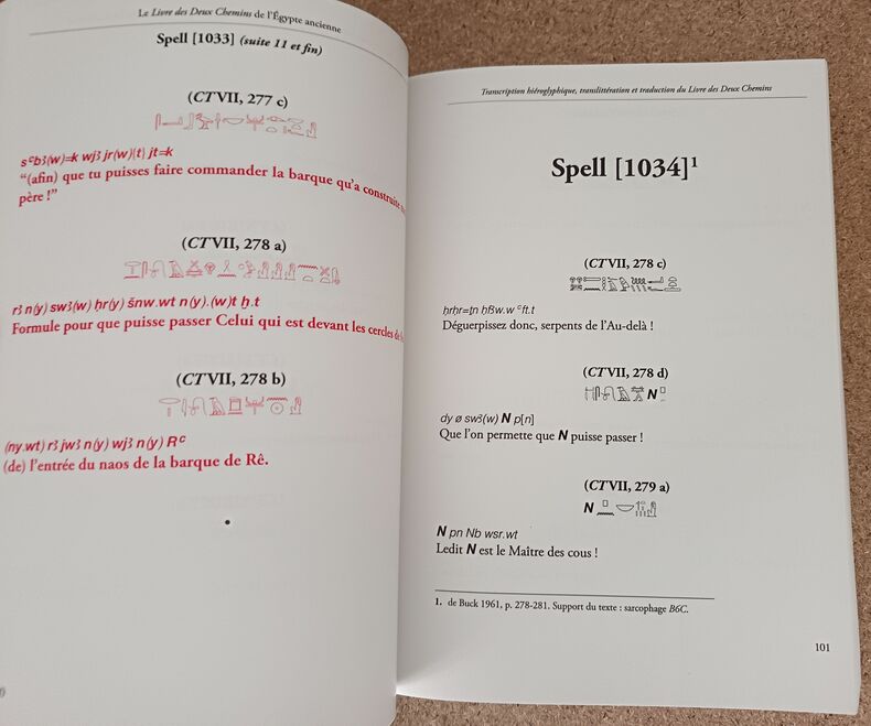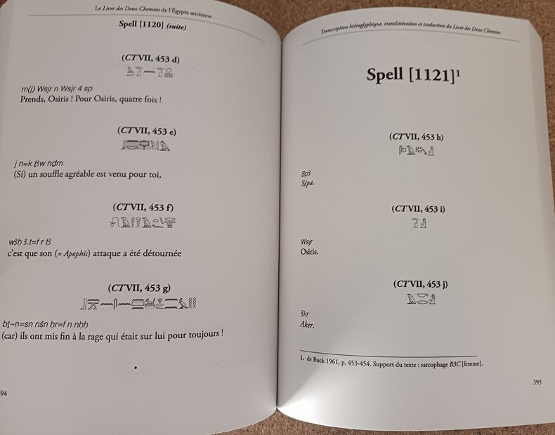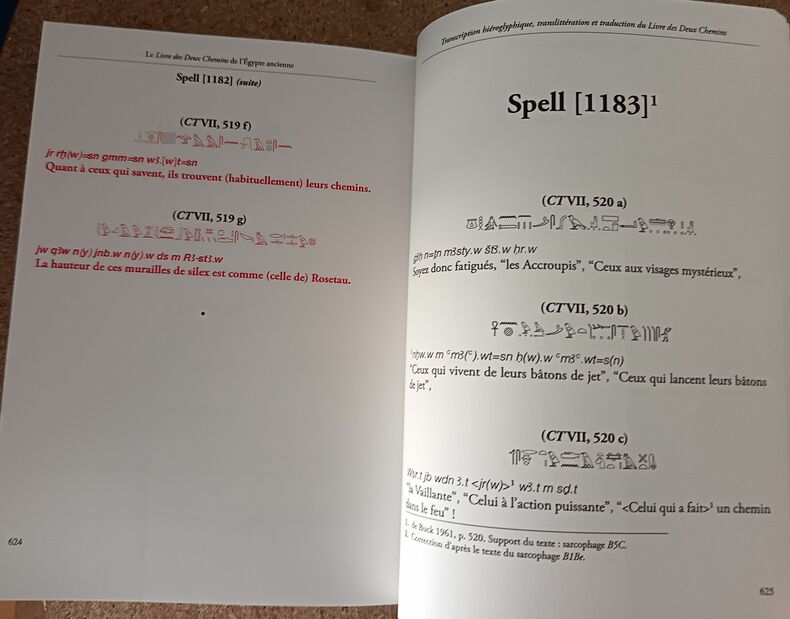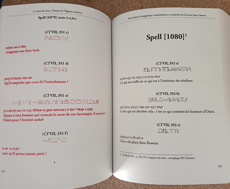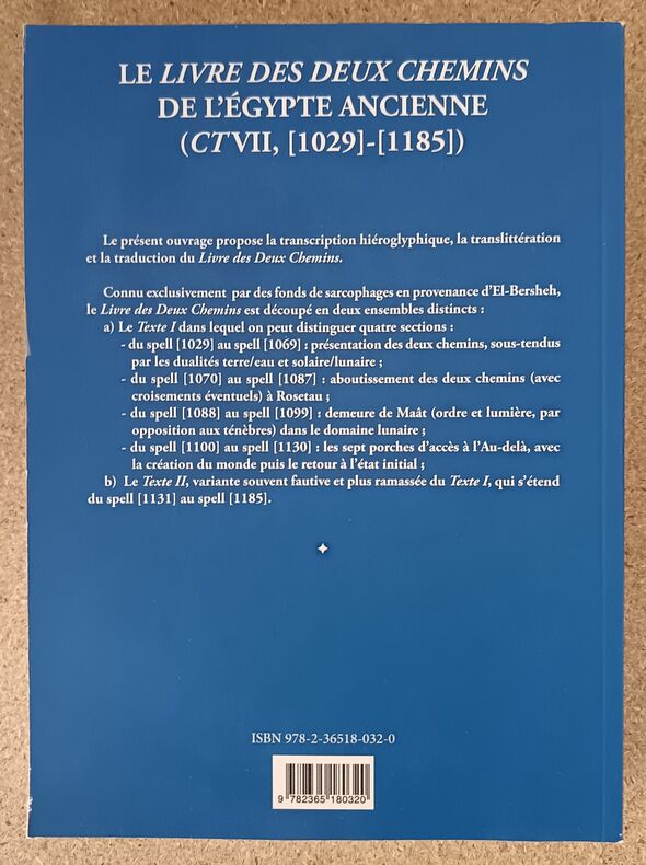 <p>Le présent ouvrage propose la transcription hiéroglyphique, la translittération et la traduction du "Livre des Deux Chemins".</p><p>Connu exclusivement par des fonds de sarcophages en provenance d'El-Bersheh, le "Livre des Deux Chemins" est découpé en deux ensembles distincts:<br>a) Le "Texte I" dans lequel on peut distinguer quatre sections:<br>-du spell [1029] au spell [1069]: présentation des deux chemins, sous-tendus par les dualités terre/eau et solaire/lunaire;<br>- du spell [1070] au spell [1087]: aboutissement des deux chemins (avec croisements éventuels) à Rosetau;<br>- du spell [1088] au spell [1099]: demeure de Maât (ordre et lumière, par opposition aux ténèbres) dans le domaine lunaire;<br>- du spell [1100] au spell [1130]: les sept porches d'accès à l'Au-delà, avec la création du monde puis le retour à l'état initial;<br>b) LE "Texte II", variente souvent fautive et plus ramassée du "Texte I", qui s'étend du spell [1131] au spell [1185].</p> Brest, 2018 672 p., broché. 17,5 x 24